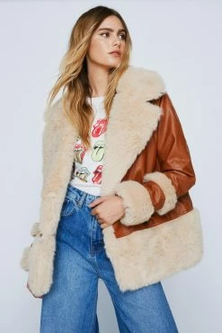 Real & Faux Leather Outfits Faux Fur Detail Faux Leather Aviator Jacket