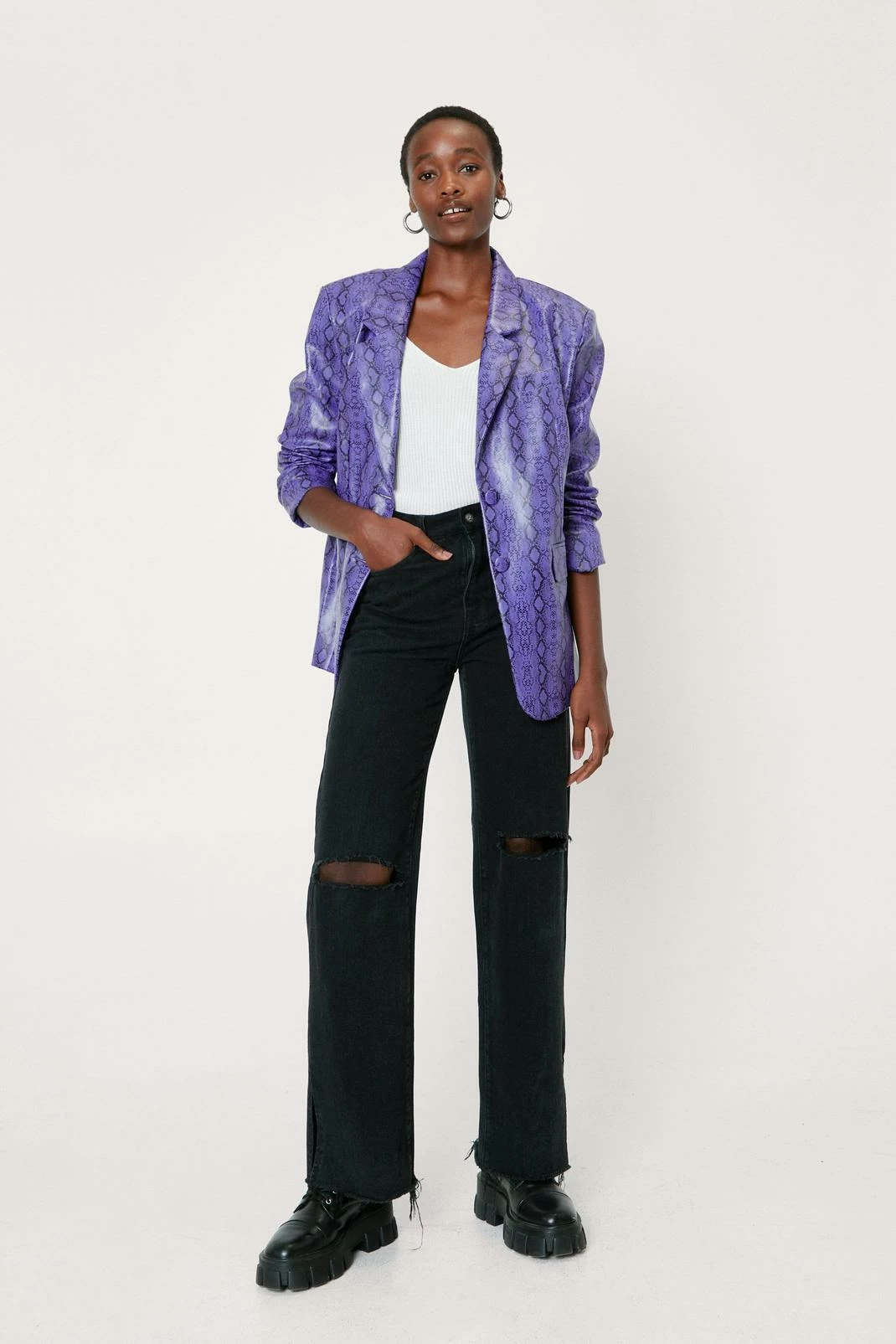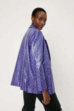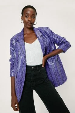 Suit up smart. This blazer comes in faux leather and features an oversized silhouette, collared neckline, notched lapels, single breasted design with double button closures, flap pockets, padded shoulders, long sleeves, and snake print throughout. Wear yours alongside tailored pants, wide leg denim jeans and chunky, recycled jewellery.