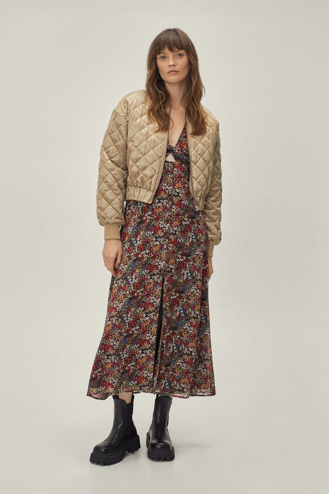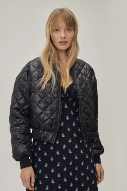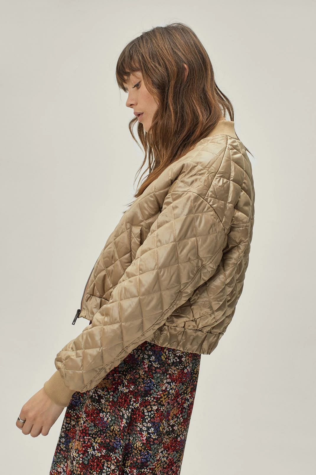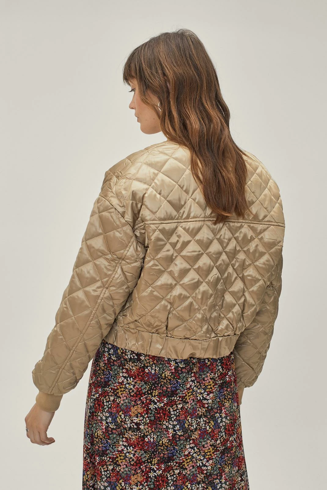 Delve into the depths of fall. This padded bomber jacket comes in a relaxed cropped silhouette and features a pull on, collarless design, long sleeves, fitted cuffs, zip closure at front, side pockets, and quilted design throughout. Wear yours with florals, midi hemlines and turtleneck tops.