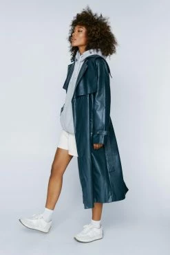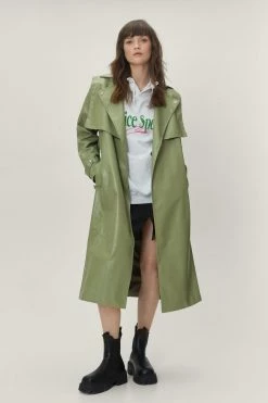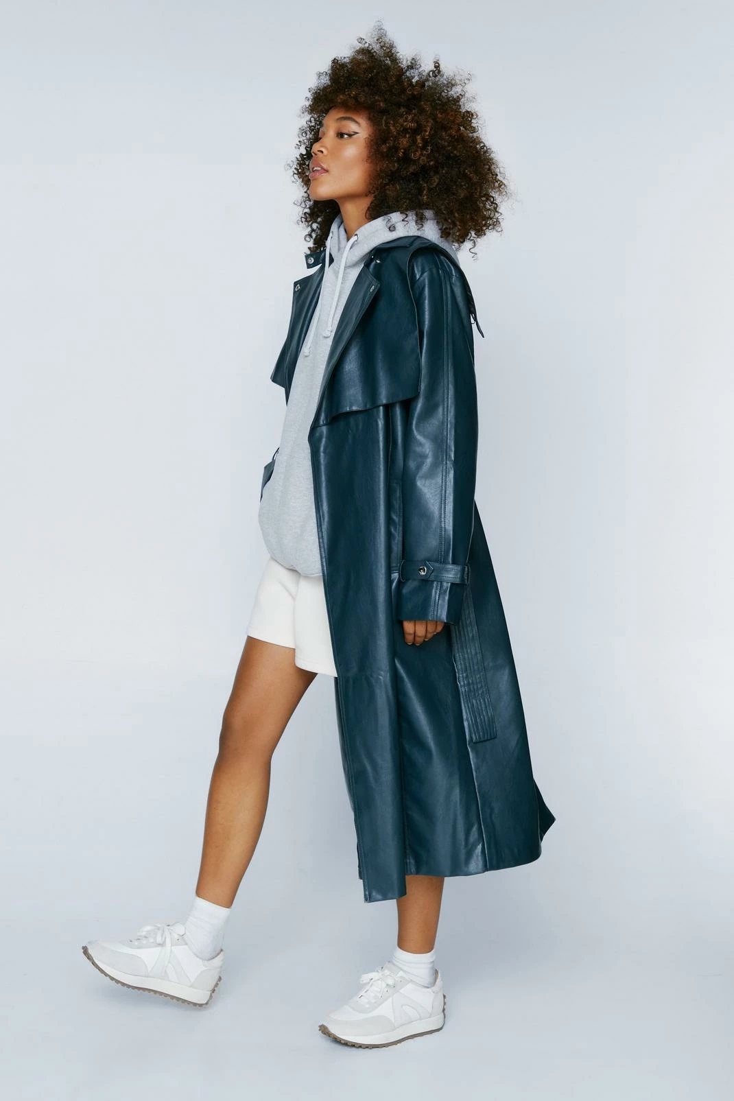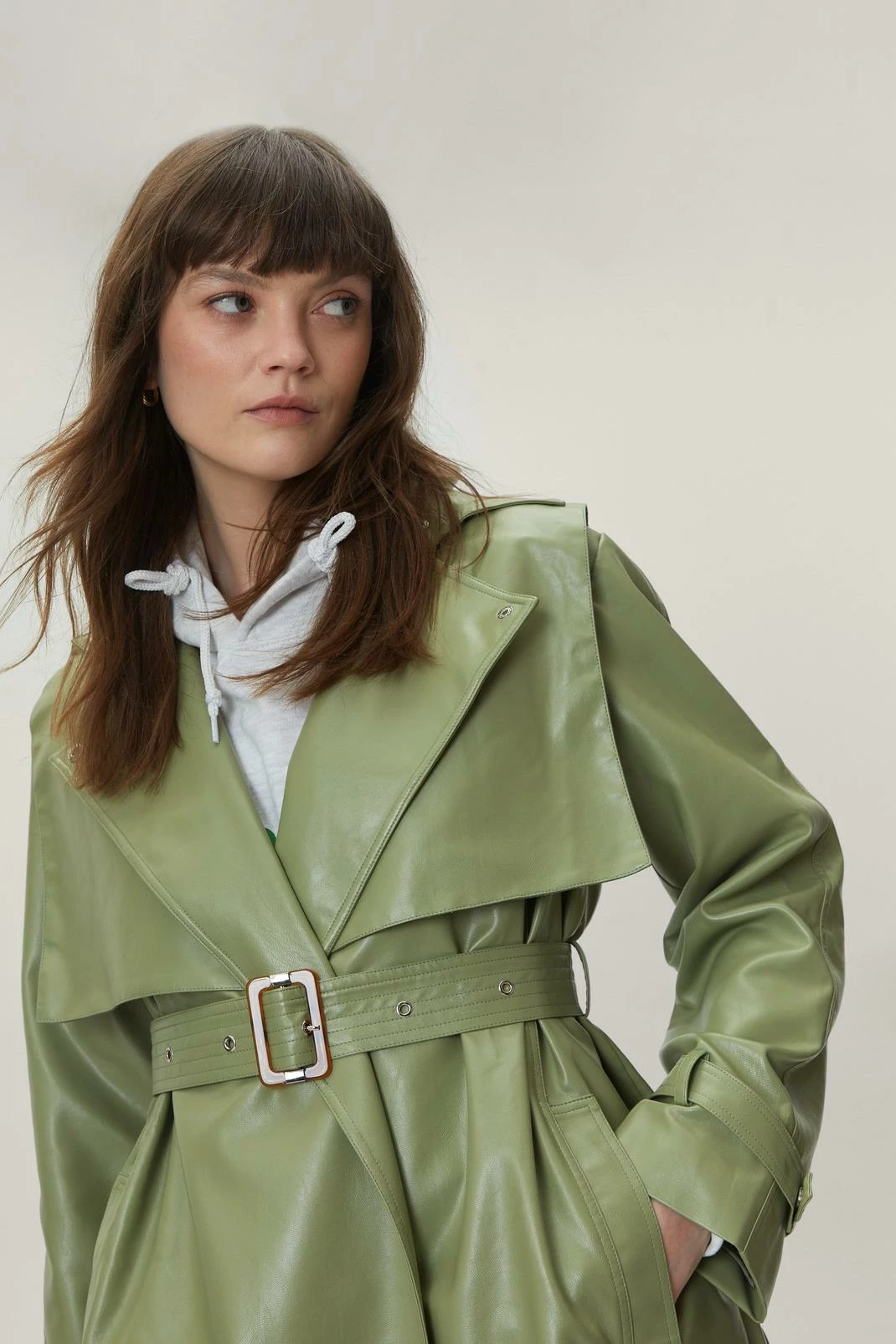 Layer up. This trench coat comes in faux leather and features a V neckline, wide notched lapels, layered design at top, relaxed, midi silhouette, belt with square buckle closure at front, pockets at sides, long sleeves, and cuffs with buckle closures. Throw over graphic oversized hoodies, faux leather mini skirts, and chunky biker boots.