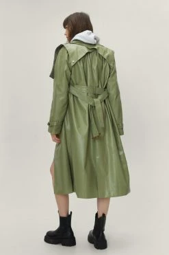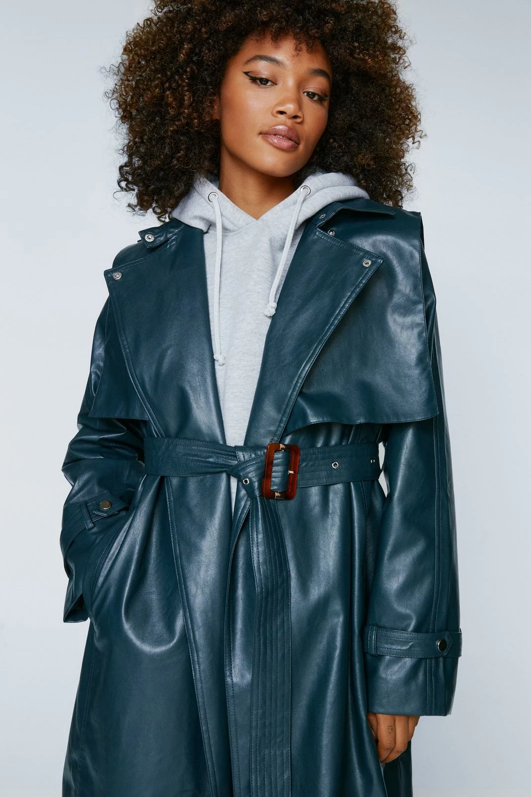 Layer up. This trench coat comes in faux leather and features a V neckline, wide notched lapels, layered design at top, relaxed, midi silhouette, belt with square buckle closure at front, pockets at sides, long sleeves, and cuffs with buckle closures. Throw over graphic oversized hoodies, faux leather mini skirts, and chunky biker boots.