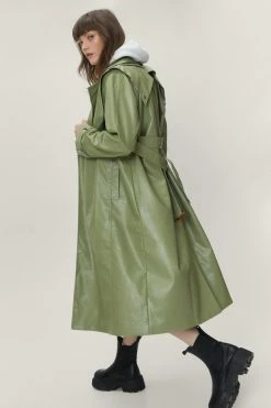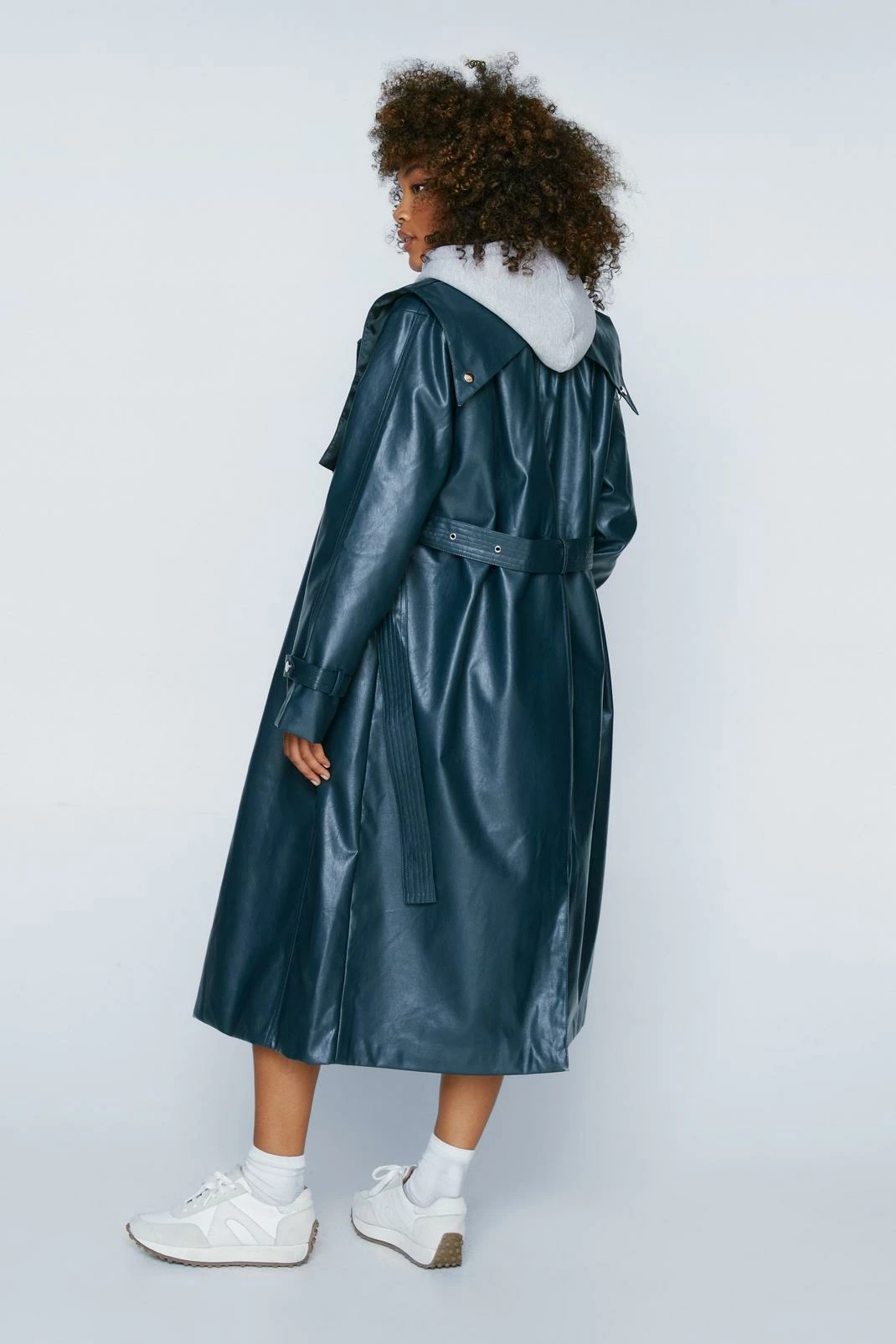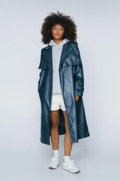 Layer up. This trench coat comes in faux leather and features a V neckline, wide notched lapels, layered design at top, relaxed, midi silhouette, belt with square buckle closure at front, pockets at sides, long sleeves, and cuffs with buckle closures. Throw over graphic oversized hoodies, faux leather mini skirts, and chunky biker boots.