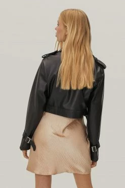 Grab your jacket. This petite jacket comes in faux leather and features a V neckline, relaxed, cropped silhouette, wide, notched lapels, layered design at top, button closures, snaps at collar, long sleeves, and straps with buckle closures.