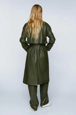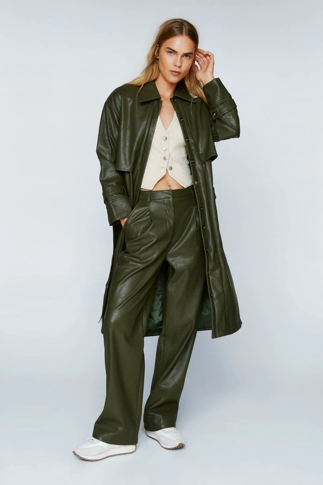 Updated outerwear. This trench coat comes in a supple faux leather and features a pointed collar, button down closure, long sleeves, tie belt at waist, and flap pockets at sides. Great for styling over sweaters and jeans, or double leather layering with faux leather pants and chunky biker boots.
