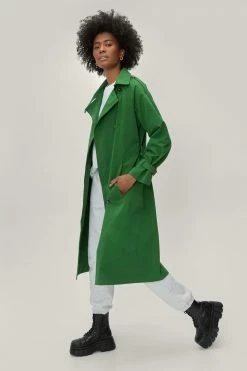 Let’s add a layer. This coat comes in twill and features a V neckline, relaxed, longline silhouette, double breasted, button down closure, long sleeves, cuffs with buckle closures, pockets at sides, and belt with buckle closure.