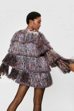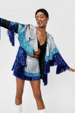 Party crasher… trust me, you can dance. This jacket features a relaxed silhouette, wide long sleeves, tiered design, multicolored metallic fringe, and open front. Model is 5’8′ and wears a US size 6/UK size 10.