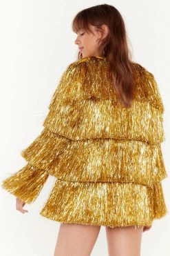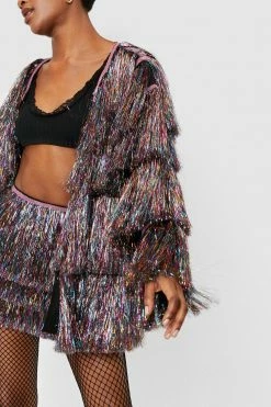 Party crasher… trust me, you can dance. This jacket features a relaxed silhouette, wide long sleeves, tiered design, multicolored metallic fringe, and open front. Model is 5’8′ and wears a US size 6/UK size 10.