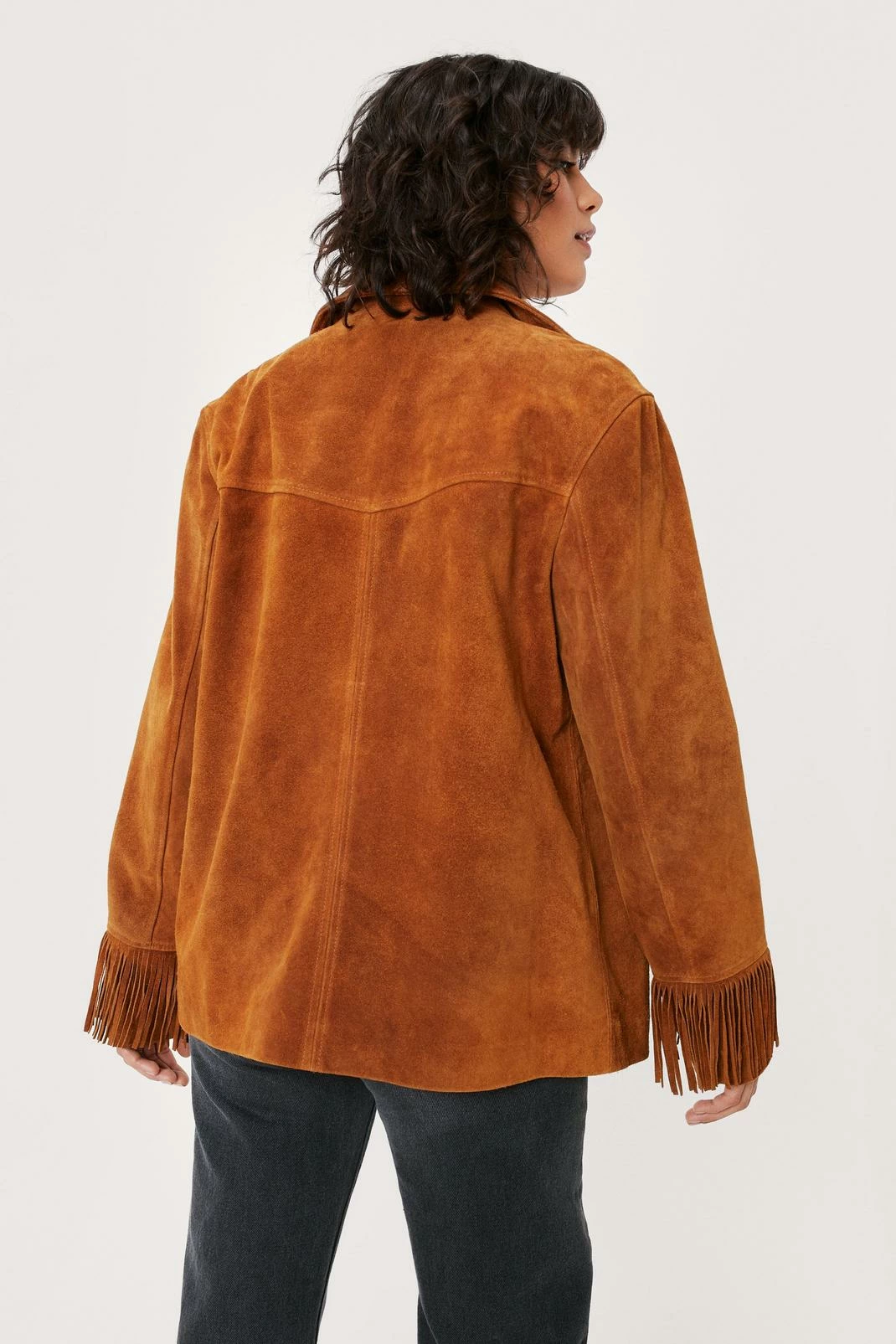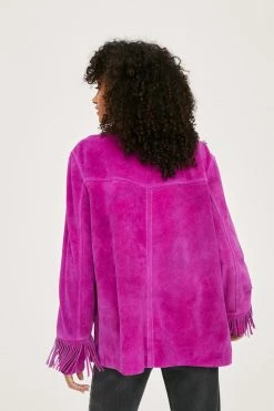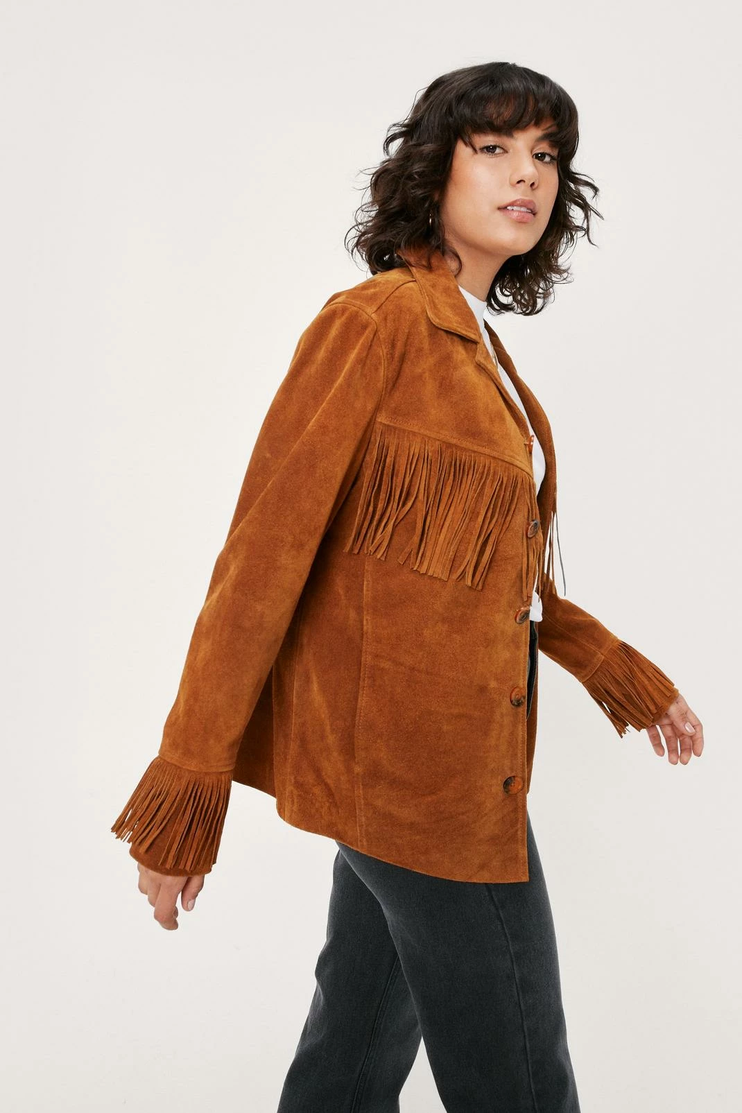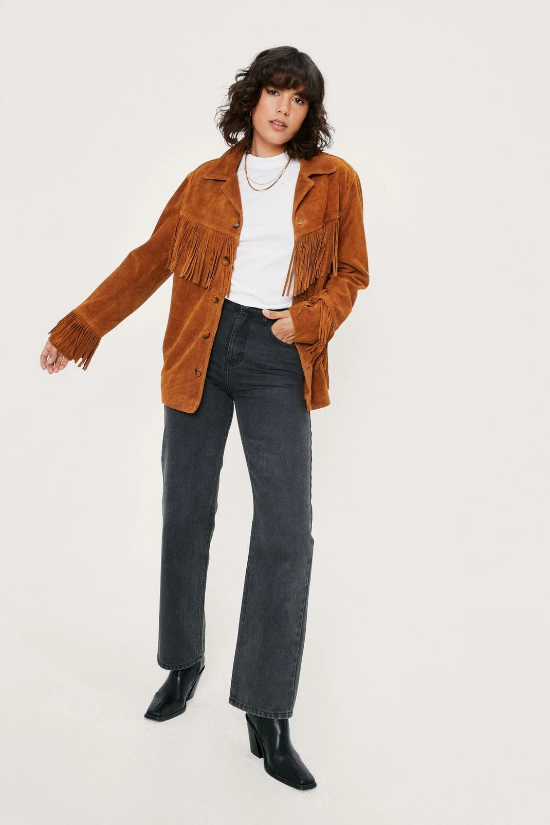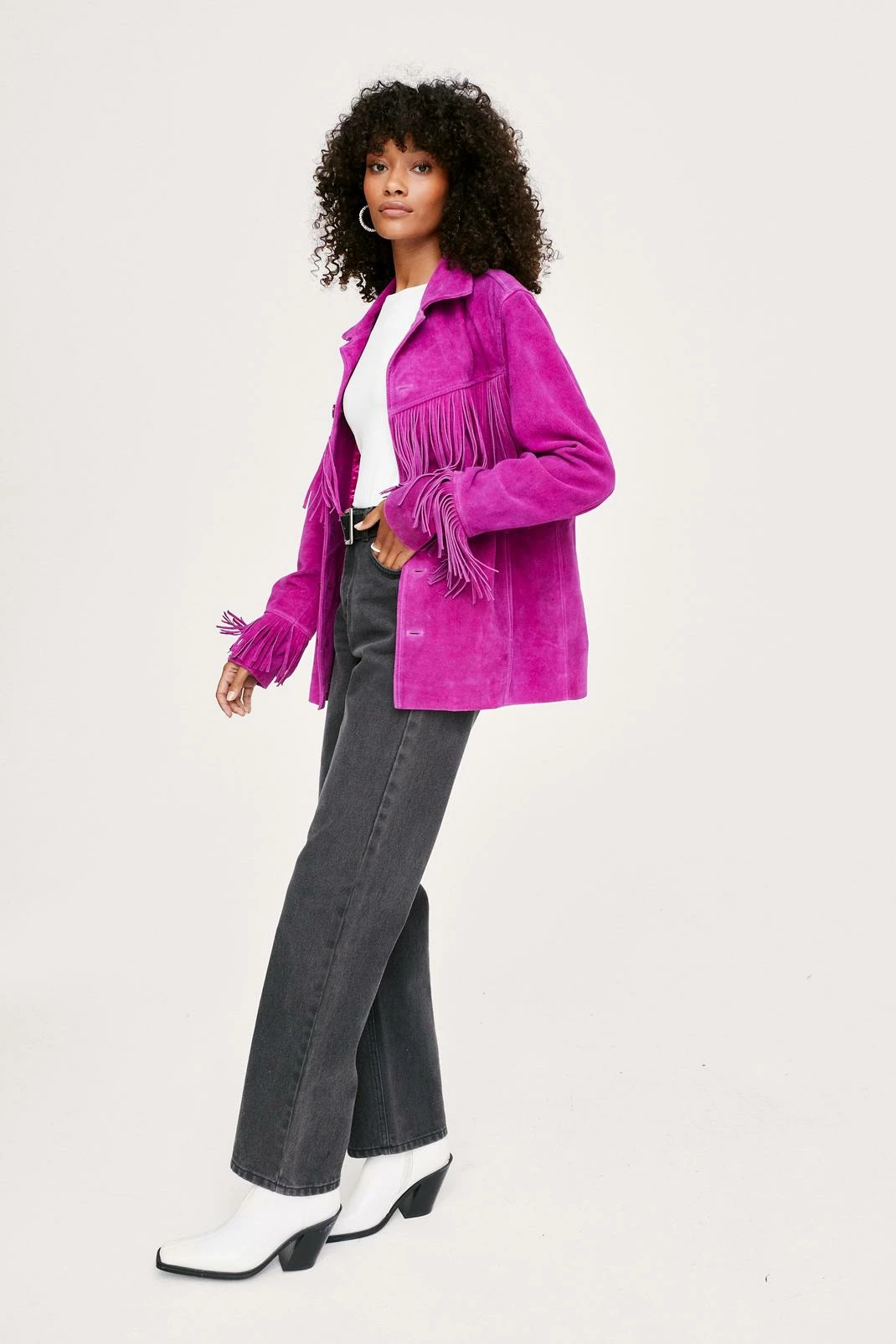 Introducing the Daily Icons—our exclusive, elevated collection of mainstay closet heroes. This jacket comes in real suede and features a relaxed silhouette, notched lapels, long sleeves, cuffs with button closures, fringe detailing, and button down closure. Rad for styling with mom jeans, short sleeved t-shirt, chunky belt, and western boots.