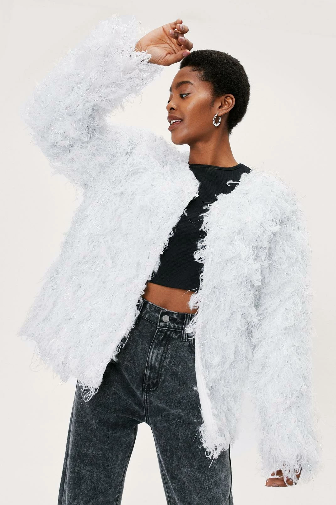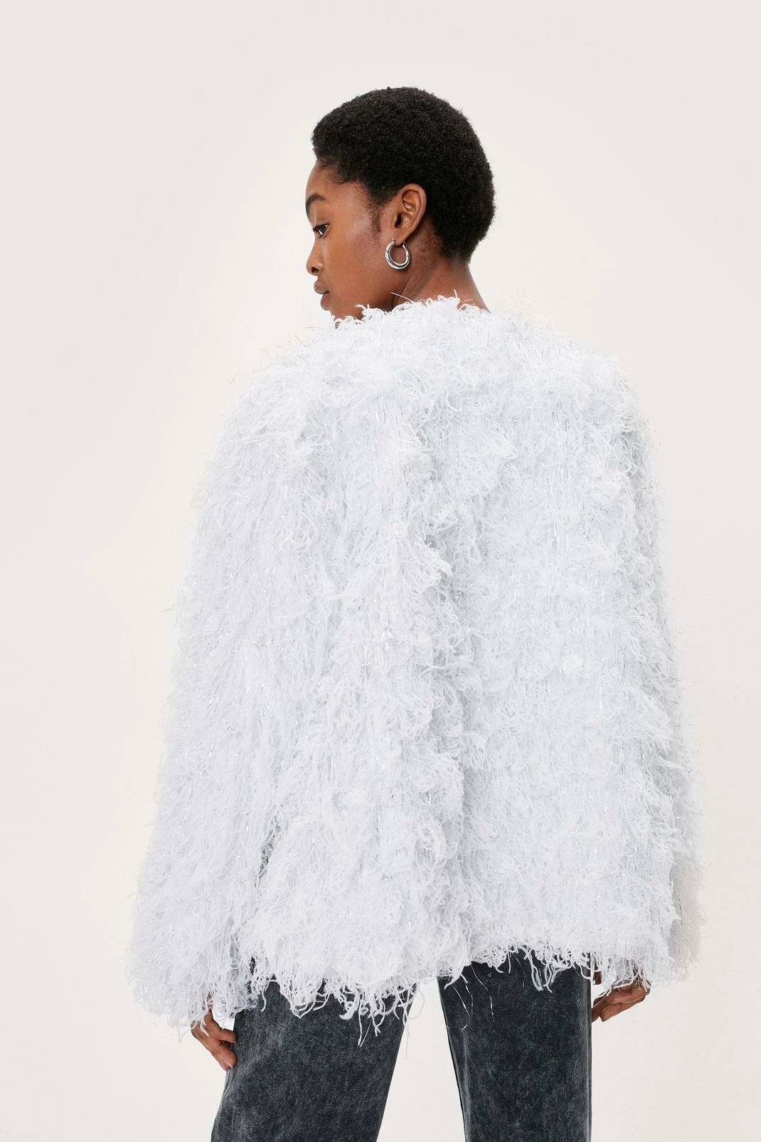 - Style: Frayed Tinsel Shaggy Long Sleeve Jacket