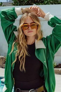 Groove on, baby. This bomber jacket comes in satin and features an oversized silhouette, pointed collar, zip closure at front, contrasting, ribbed eges, and drop sleeves with fitted cuffs.