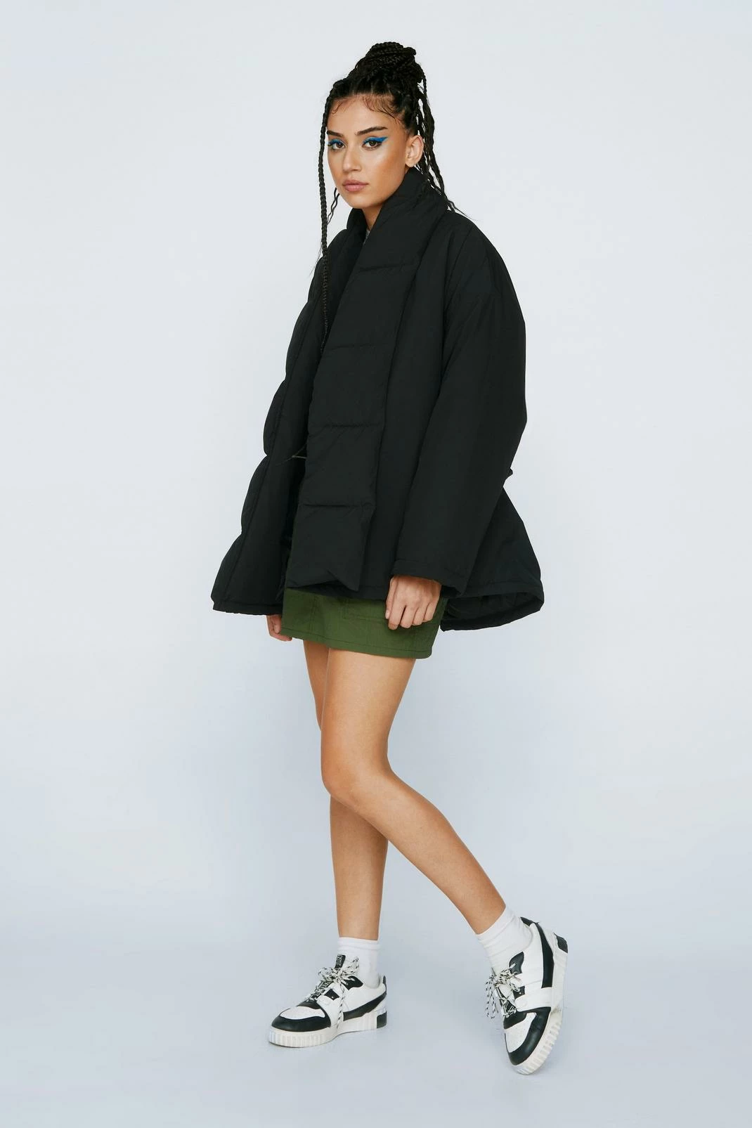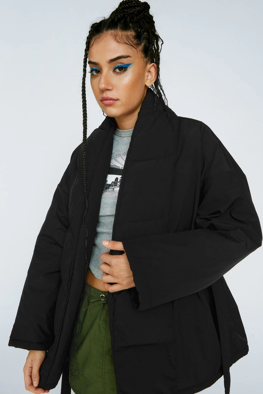 Go incognito. This off-duty dressing essential jacket comes padded and features an oversized silhouette, shawl lapels, kimono-style long sleeves, open front design, and detachable belt at waistline. Wrap up warm by layering yours over ribbed knit sweaters and jersey hoodies.
