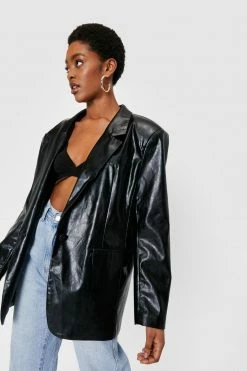 Part of the badass babes uniform. This blazer comes in faux leather and features an oversized silhouette, wide, notched lapels, padded shoulders, long sleeves, button down closure at front, and decorative, flap top pockets at sides. Rock with high waisted mom jeans, a classic crop top, and a pair of strappy, stiletto heels. Model is 5’9″ and wears a US size 6/UK size 10.