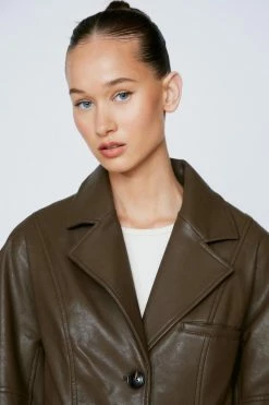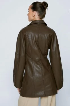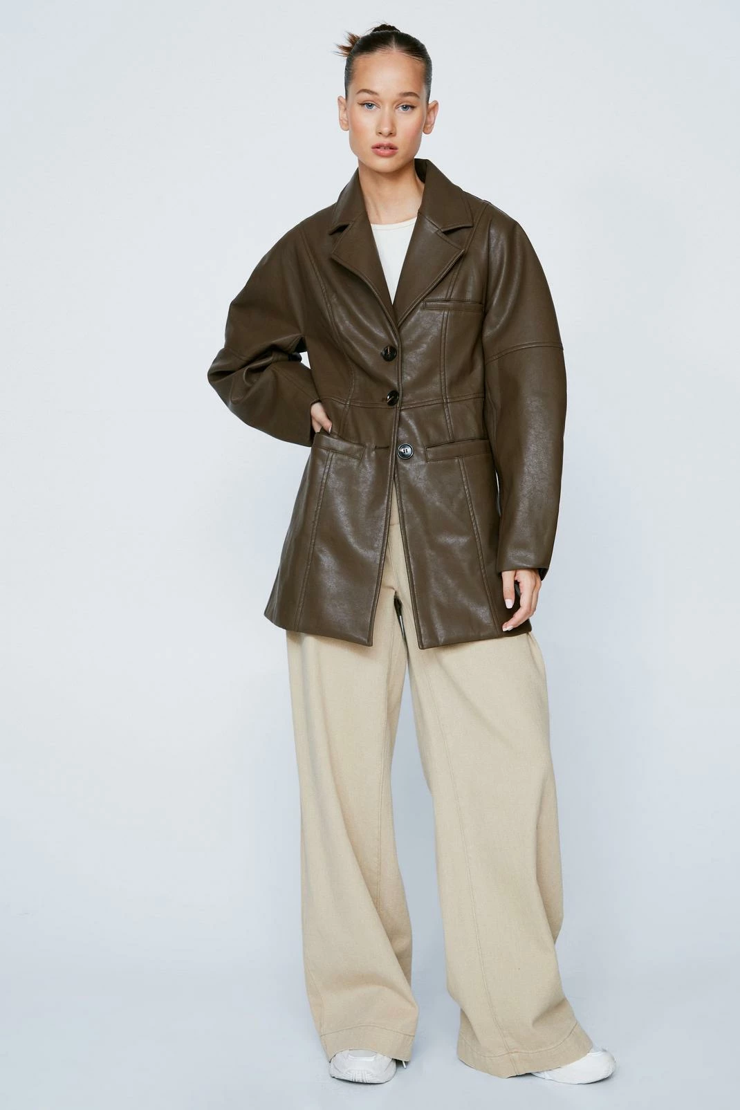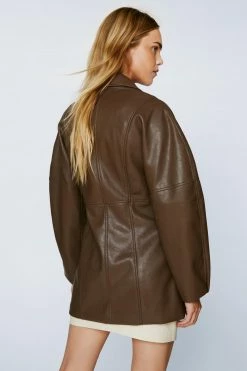 Leather weather. This blazer comes in premium faux leather and features a loose, single-breasted silhouette, button closures, pointed collared neckline, oversized notched lapels, decorative pockets, long balloon sleeves, and seam detailing. Team yours with an oversized graphic T-shirt and a classic bodycon mini skirt.