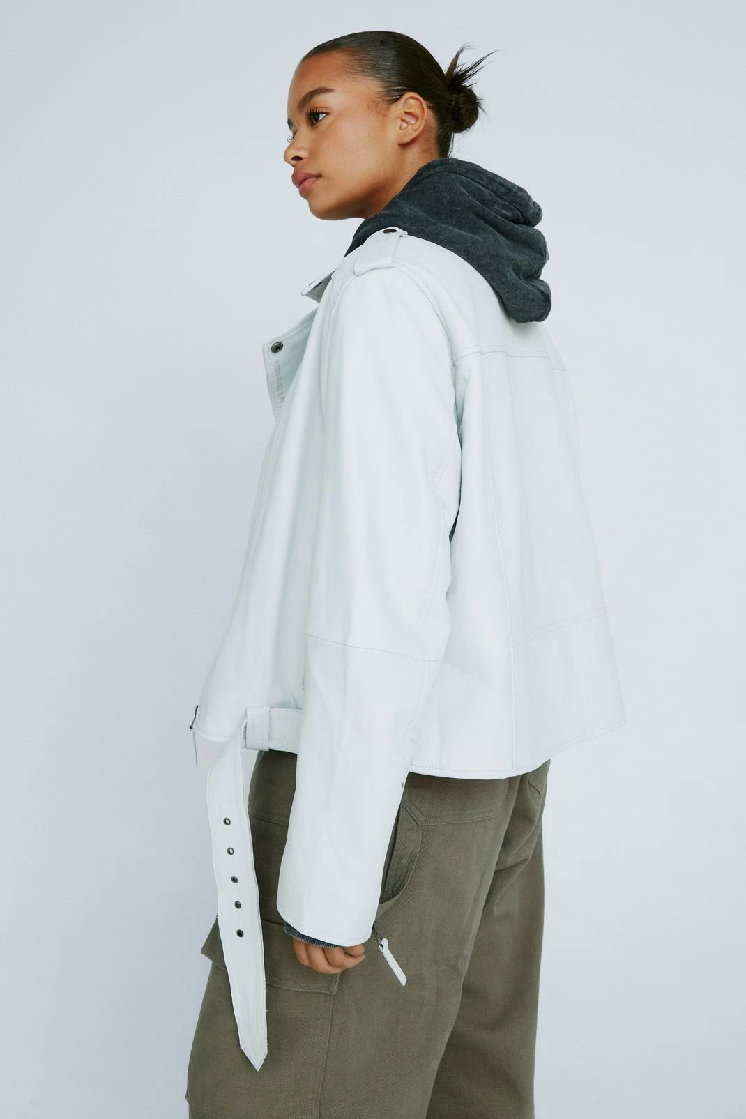 We were born to be wild. This real jacket comes in leather and features an oversized silhouette, zip closure at front, notched lapels with snap closures, long sleeves, cuffs with zip closures, asymmetric zip pockets, belt at waist with buckle closure, and pockets at front with snap closures. Throw on with your mom jeans, a plain t-shirt and chunky biker boots.