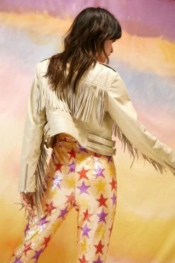 Subversive styling. Let your rebel heart shine in this real leather biker jacket. It features a cropped design, relaxed silhouette, pointed collared neckline, notched lapels, zip closure throughout front, long sleeves with fringe detailing, and fringing at yolk. Use yours to toughen up your sequin shift dresses, mini satin numbers, and little black dresses.