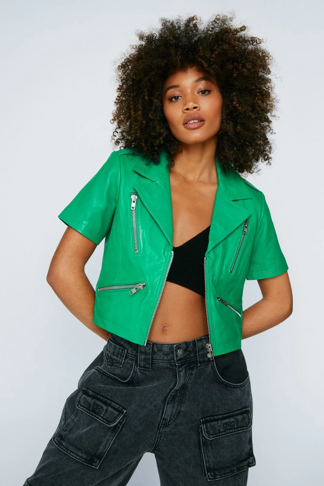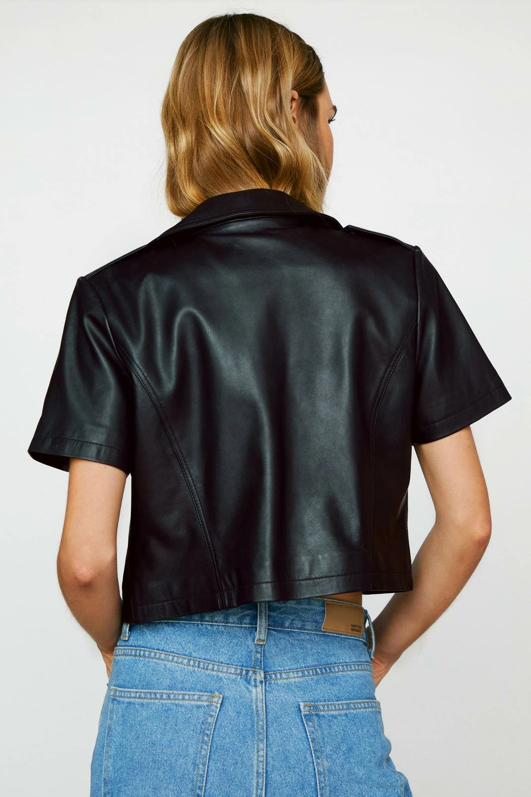 Ditch the sleeves. This jacket comes in a supple faux leather and features a loose fit, cropped silhouette, unique short sleeve design, notched lapels, and asymmetric zip pockets. A closet classic perfect for warmer months. Great for styling staple straight leg jeans, a basic tank top and platform boots.
