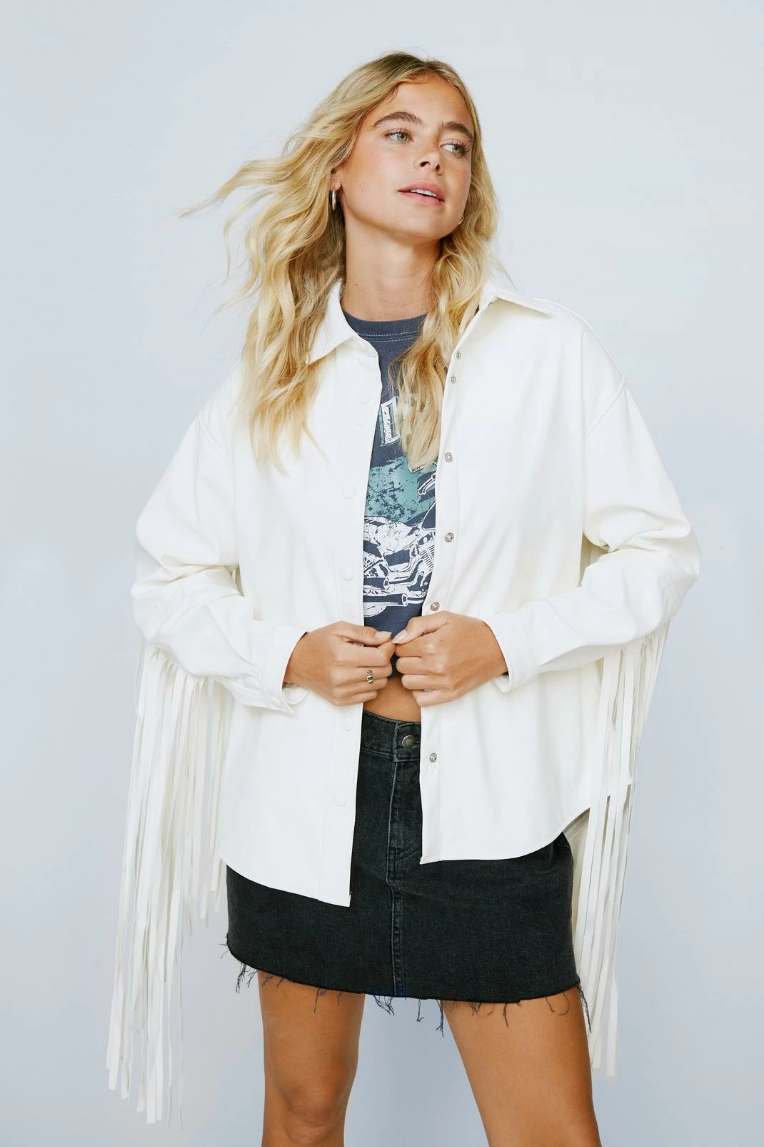 Introducing the Daily Icons—our exclusive, elevated collection of mainstay closet heroes. This shirt jacket comes in faux leather and features an oversized silhouette, pointed collar, button down closure at front, long sleeves with fitted cuffs, and fringe detailing at back. The kinda iconic jacket that’s always good to have around.