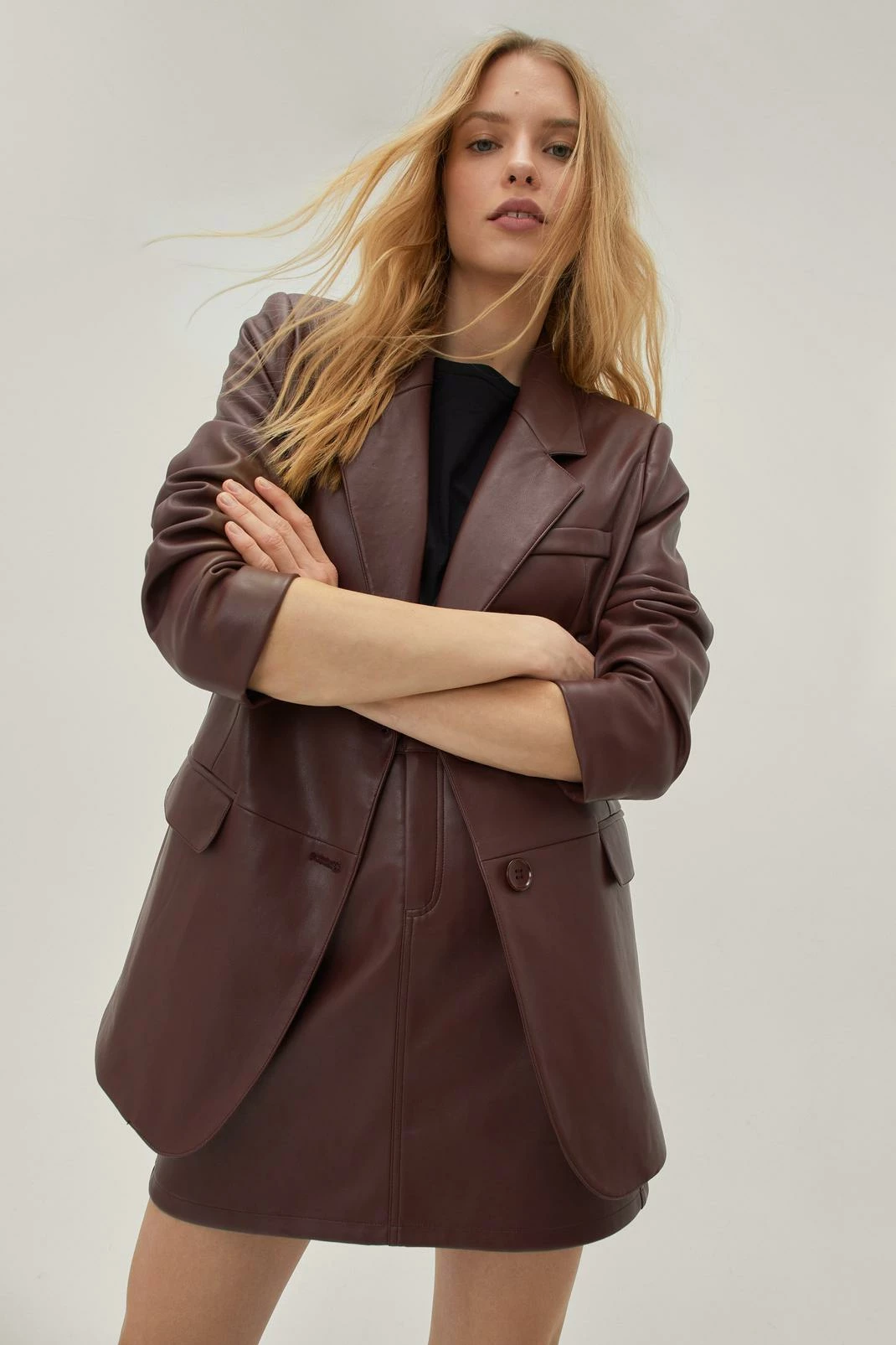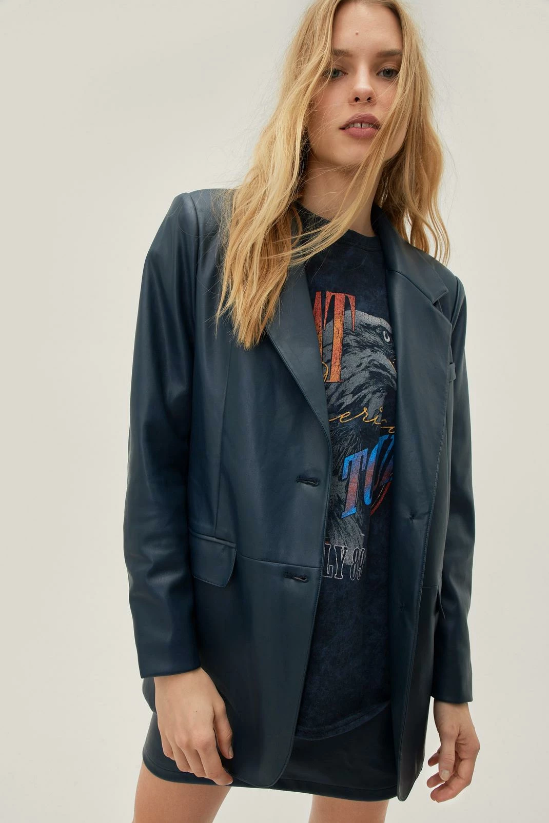 Double leather days. This blazer comes in faux leather and features padded shoulder, single breasted button closures, notched lapels, and flap pockets at front. Style with the coordinating mini skirt and lace-up high ankle biker boots.