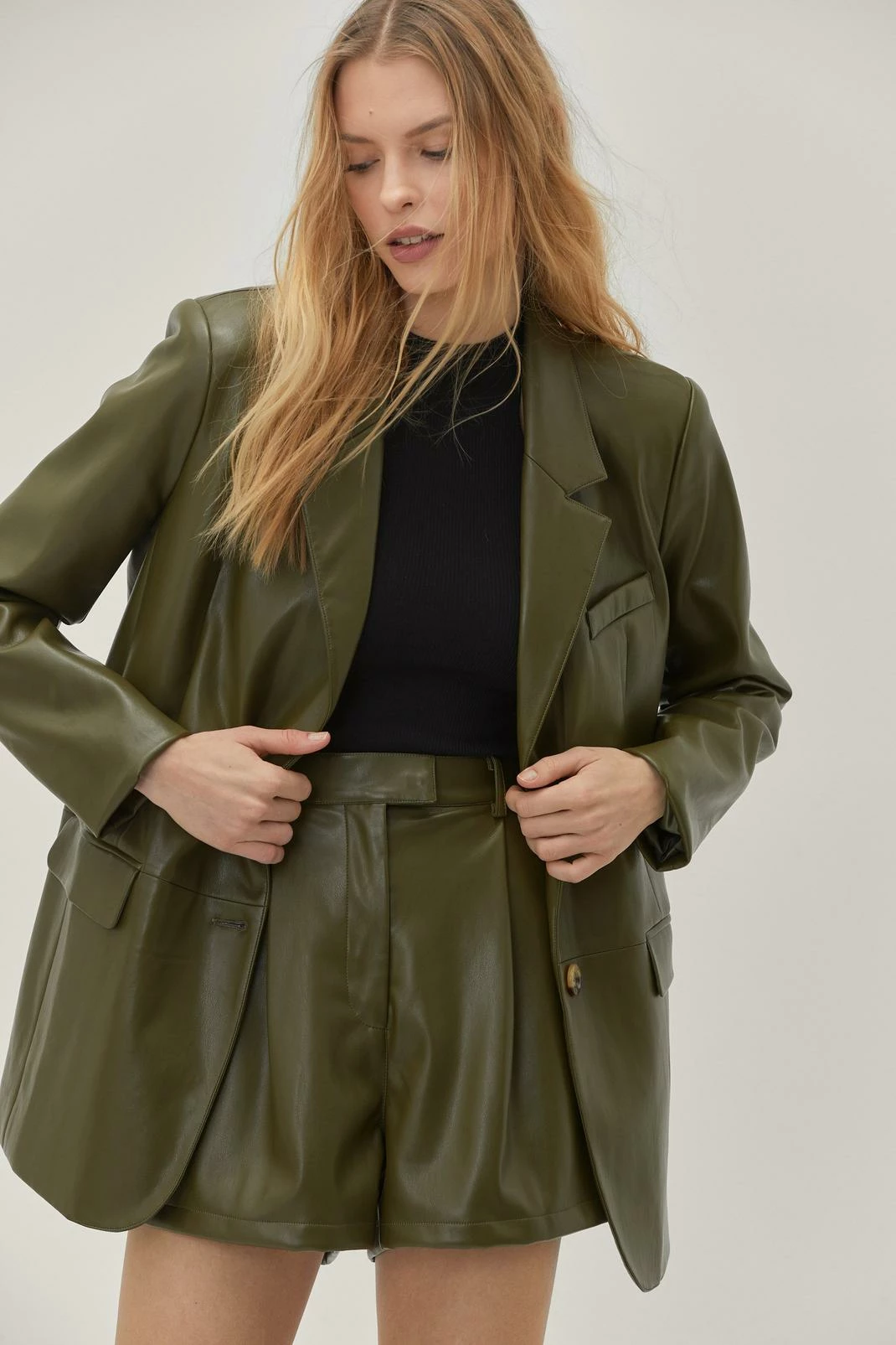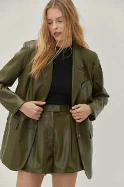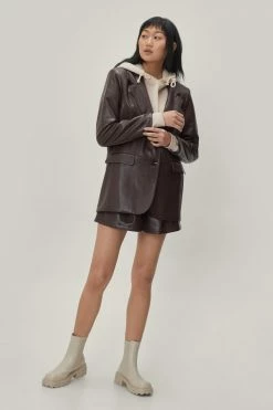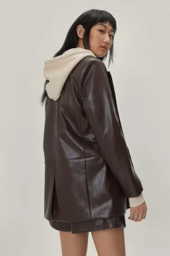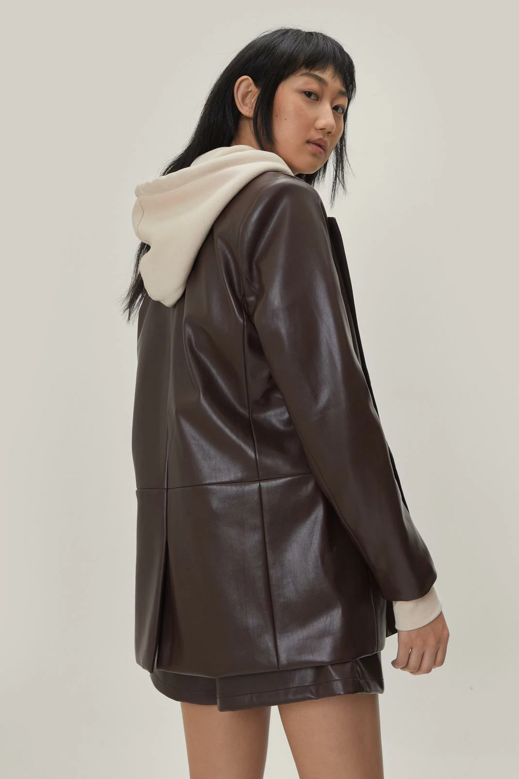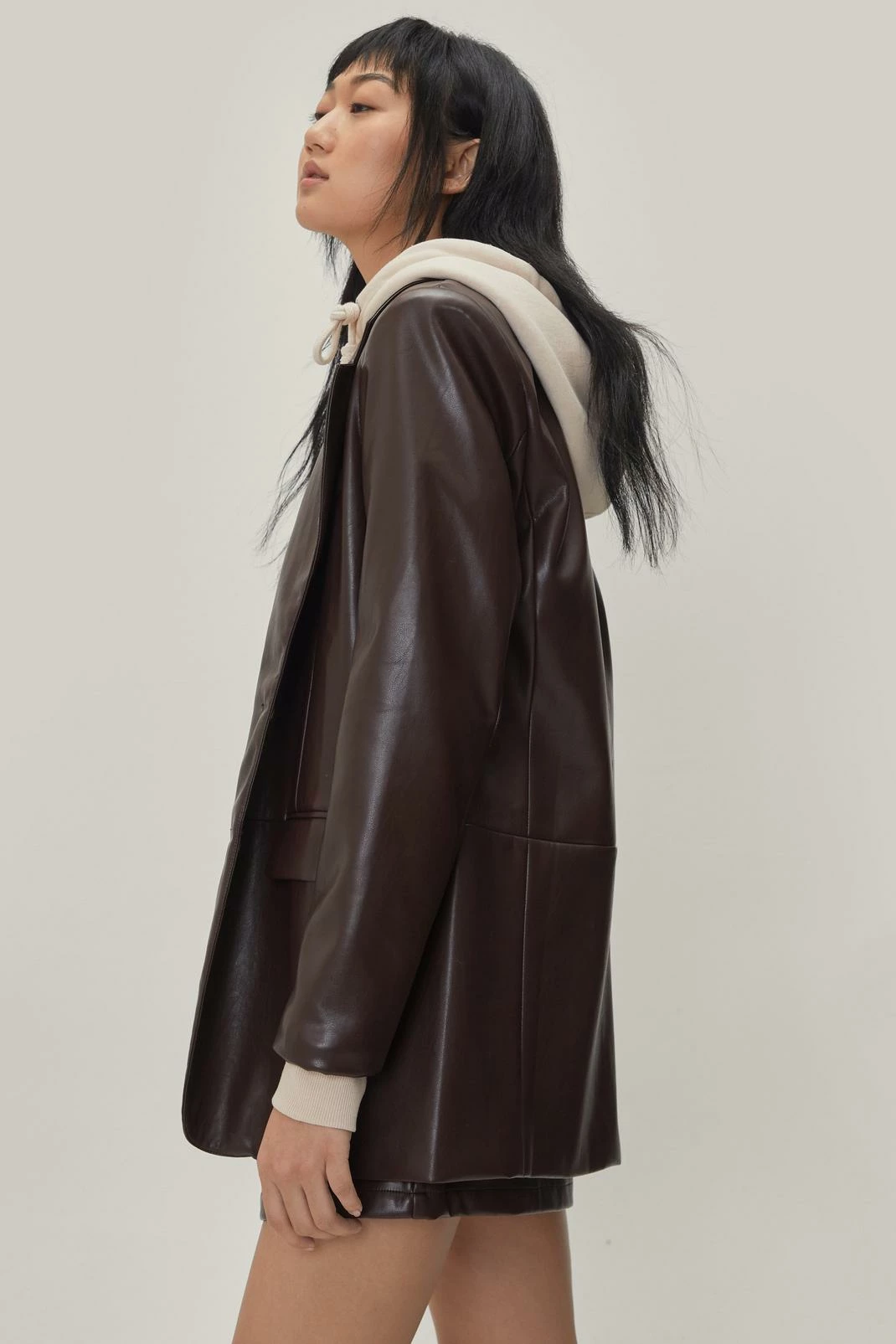 Suit up. Suiting sets that take you from desk to disco with nothing but a touch of lipgloss. This blazer comes in faux leather and features a tailored, longline silhouette, long sleeves, single breasted, button closure, notched lapels, flap pockets at front, and split at back.