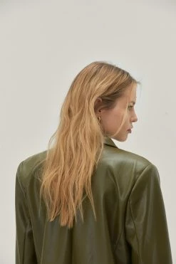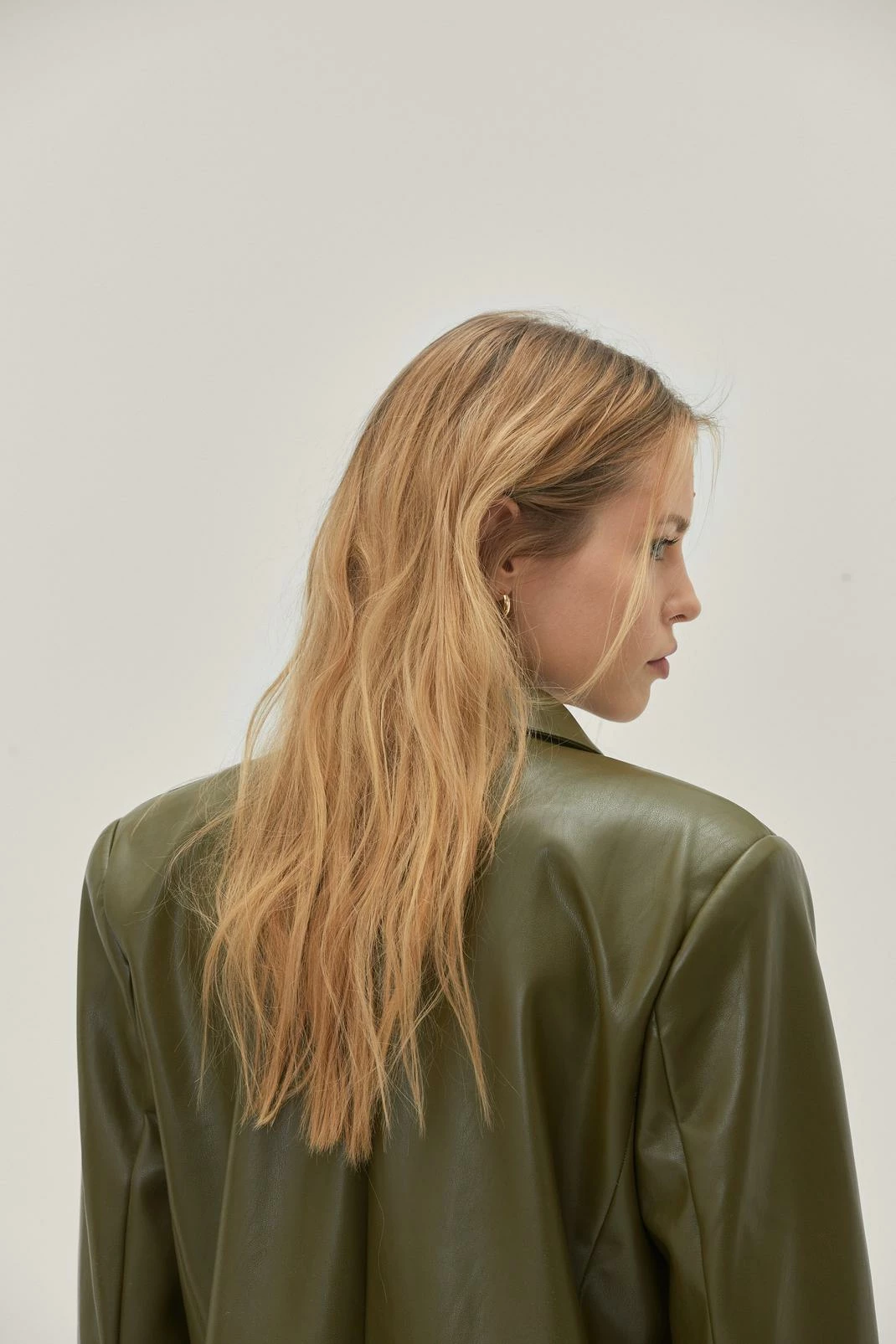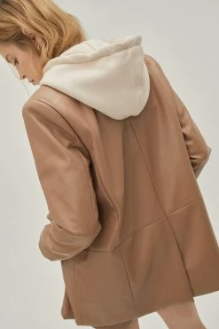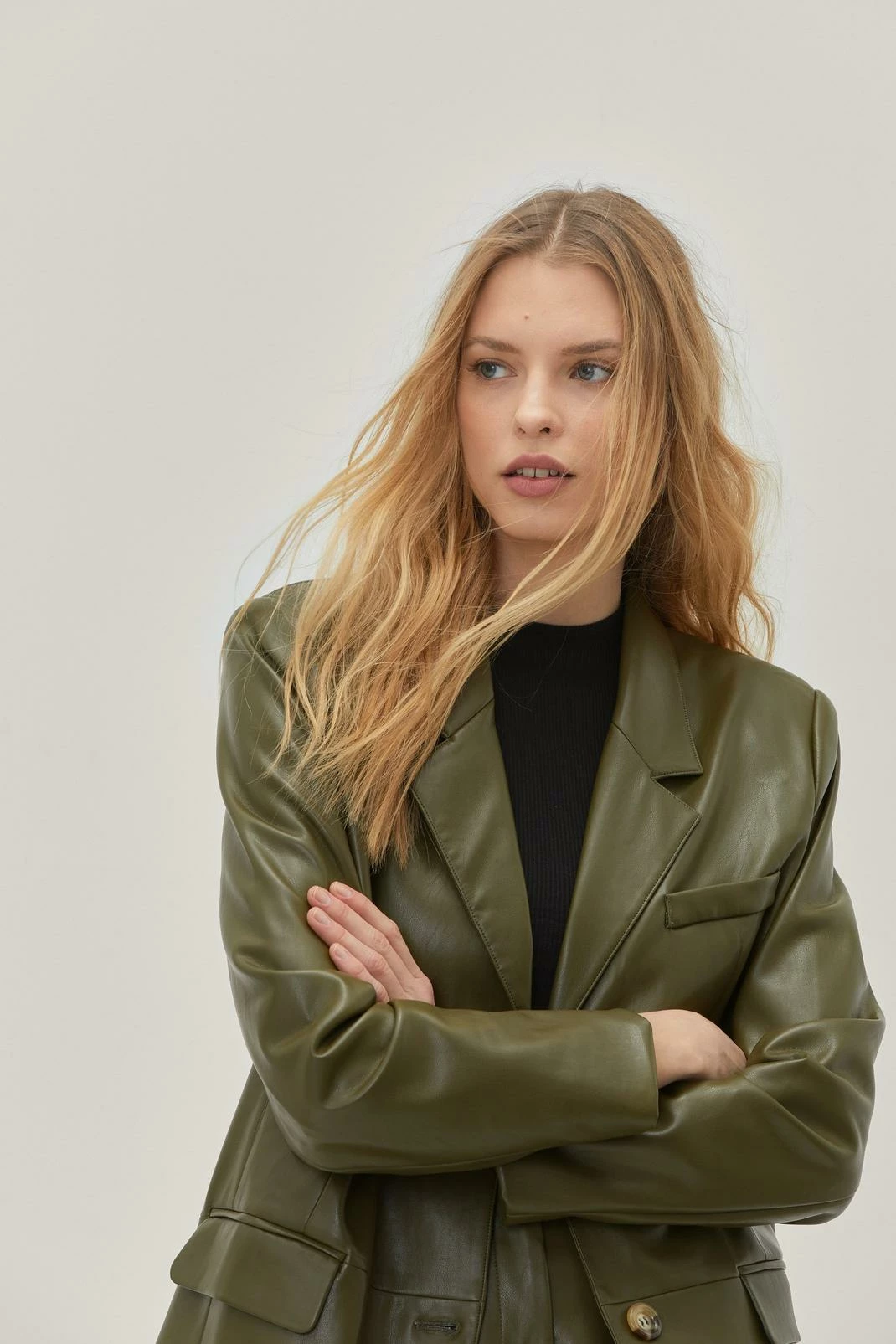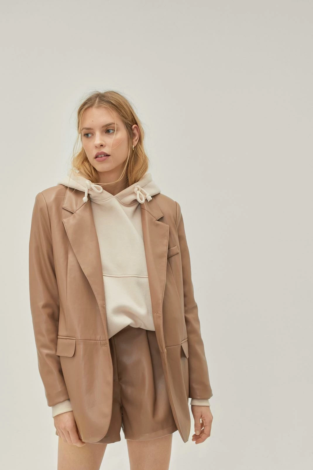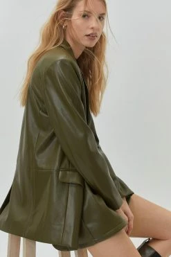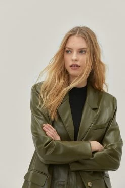Suit up. Suiting sets that take you from desk to disco with nothing but a touch of lipgloss. This blazer comes in faux leather and features a tailored, longline silhouette, long sleeves, single breasted, button closure, notched lapels, flap pockets at front, and split at back.