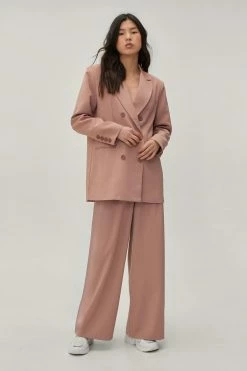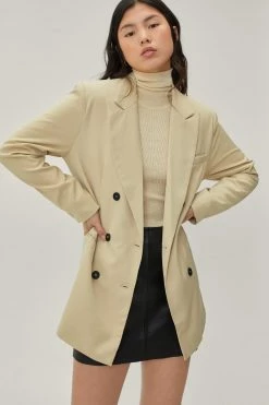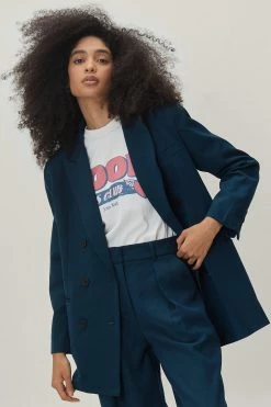 Suit up smart. This tailored jacket features an oversized, longline silhouette, padded shoulders, oversized, notched lapels, double breasted, button-down closures, long sleeves, buttoned cuffs, suit vent, and decorative front pockets. Goes well with matching tailored suit pants.