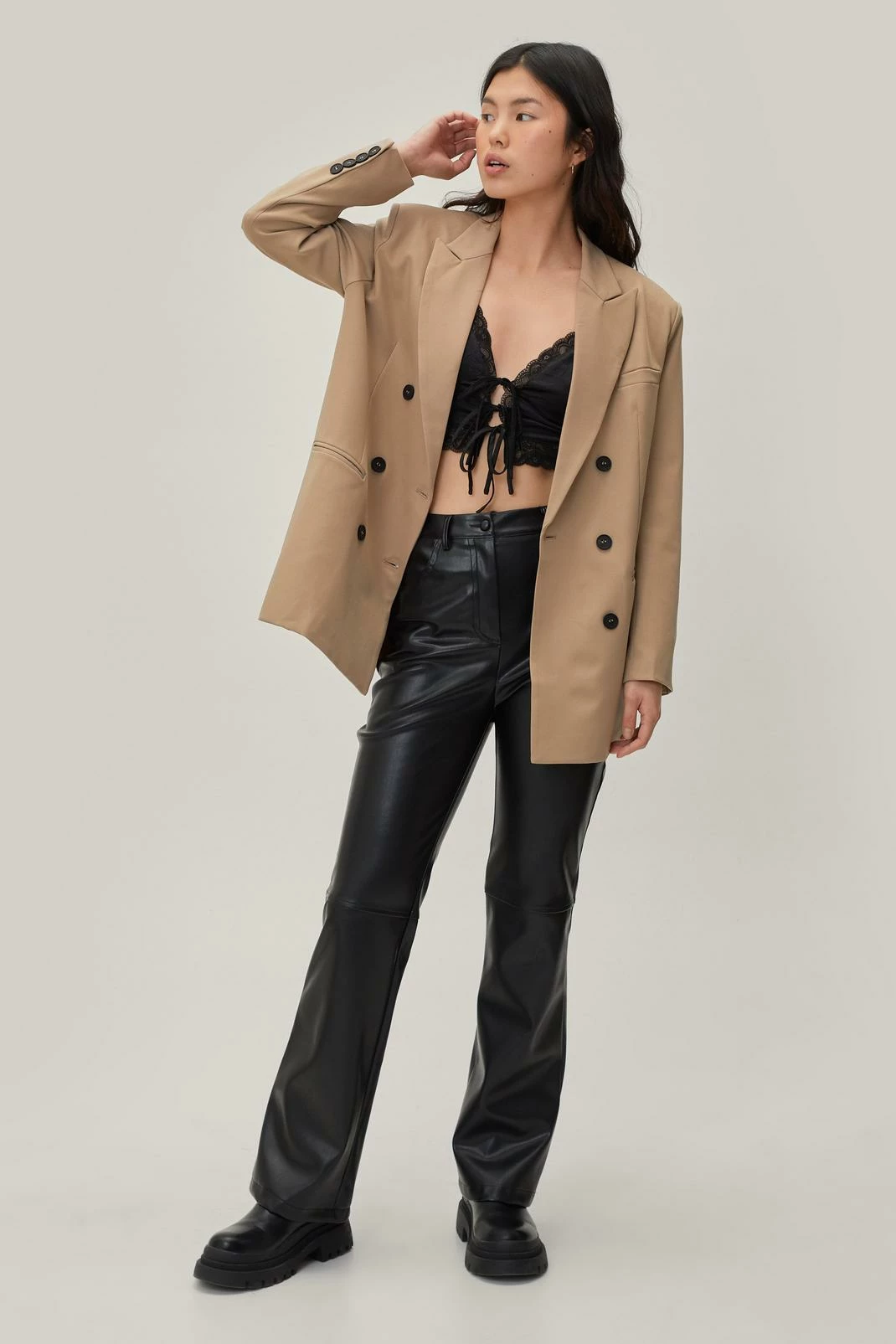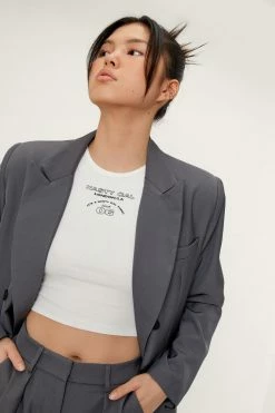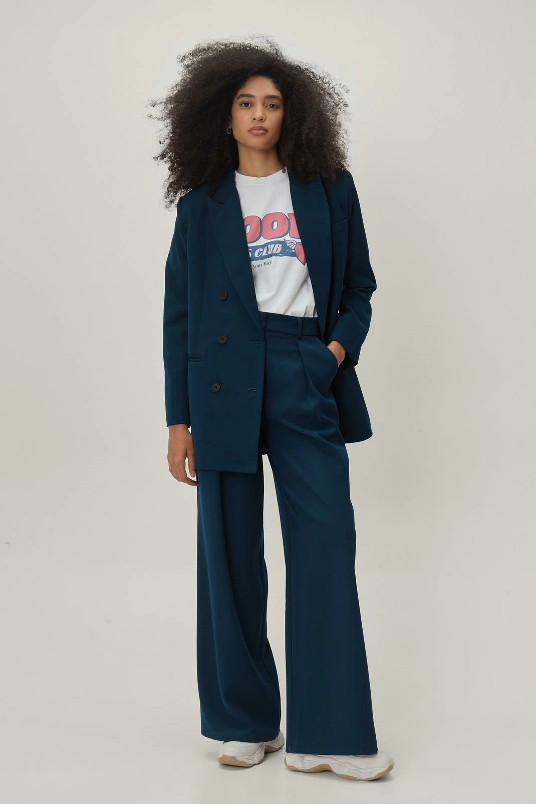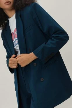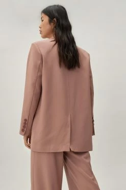 Suit up smart. This tailored jacket features an oversized, longline silhouette, padded shoulders, oversized, notched lapels, double breasted, button-down closures, long sleeves, buttoned cuffs, suit vent, and decorative front pockets. Goes well with matching tailored suit pants.