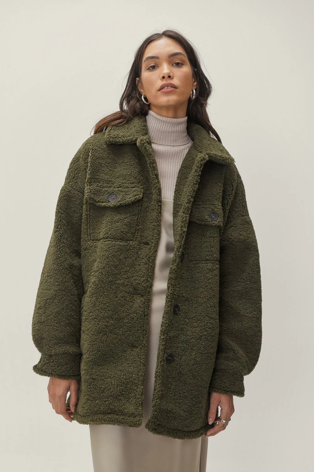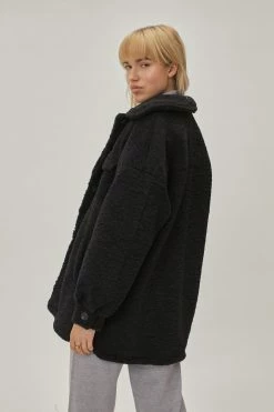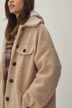 Faux fur season. This jacket comes in faux fur and features a pointed collar, relaxed, longline silhouette, drop, long sleeves, cuffs with button closures, flap pockets at front, and pockets at sides. Style yours over a knitted midi dress and style with chunky wellie boots.