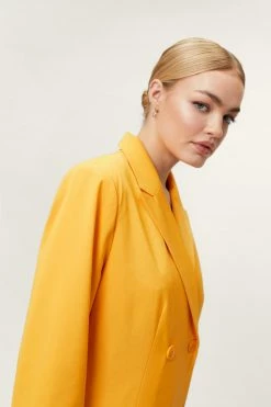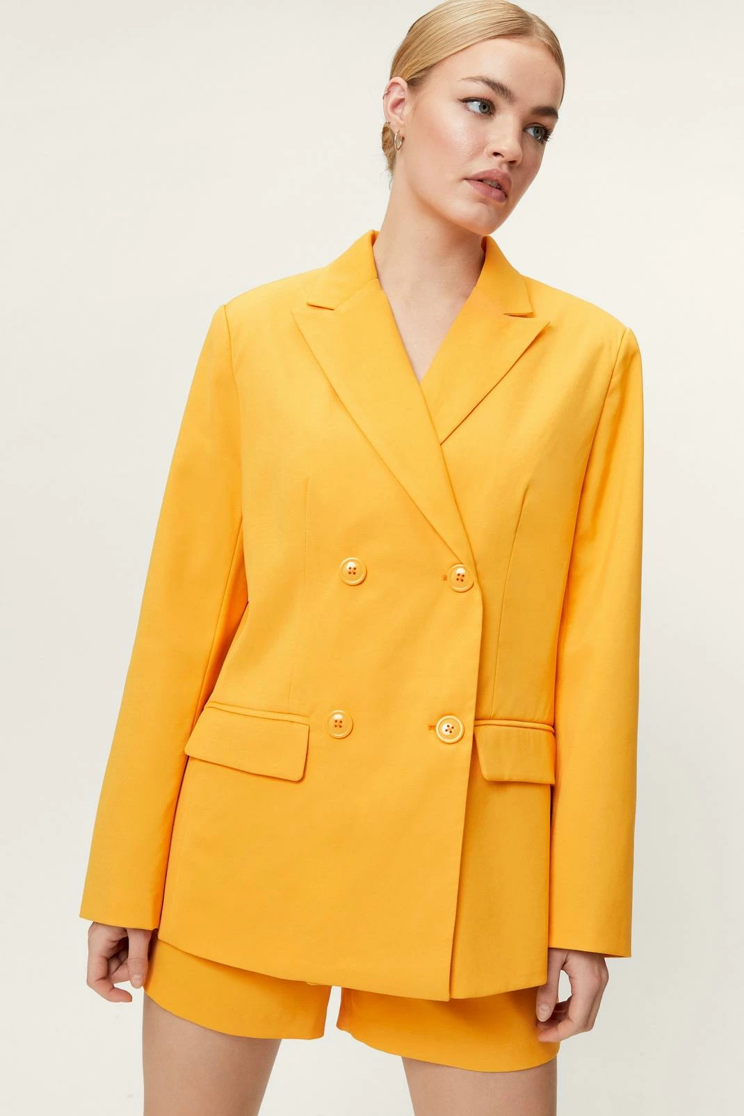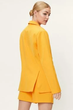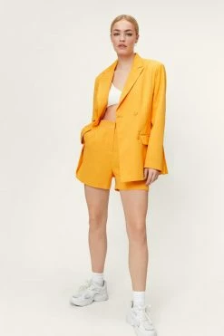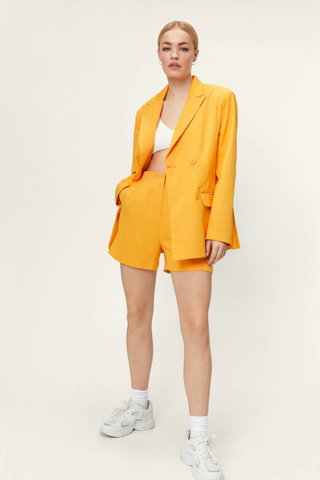 Modern power dressing. This oversized blazer is made from a thick, woven fabric, and features a pointed collared neckline, peaked lapels, a double breasted design with button detailing, split hem, long sleeves, and decorative pocket at bust. Complete the look and style with the matching shorts, a cropped bralette, and platform sneakers. Item sold separate.