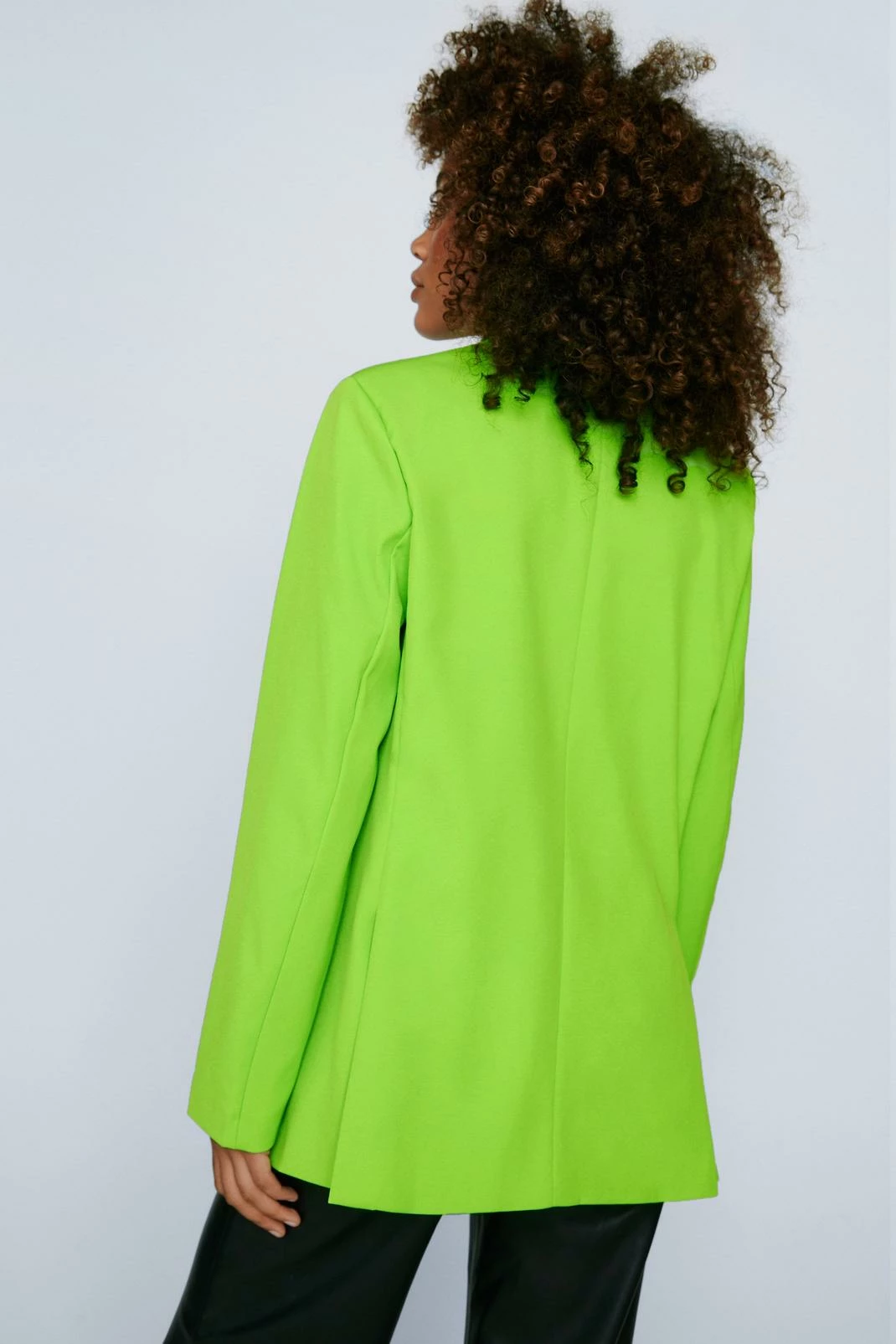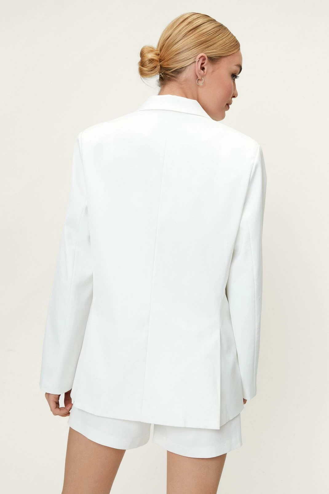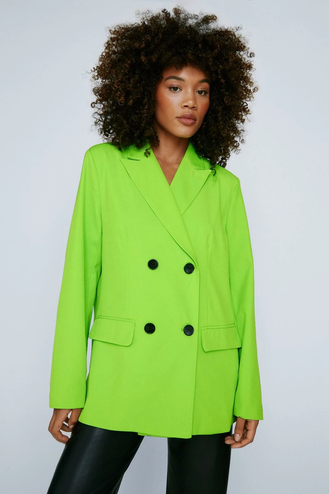 Modern power dressing. This oversized blazer is made from a thick, woven fabric, and features a pointed collared neckline, peaked lapels, a double breasted design with button detailing, split hem, long sleeves, and decorative pocket at bust. Complete the look and style with the matching shorts, a cropped bralette, and platform sneakers. Item sold separate.