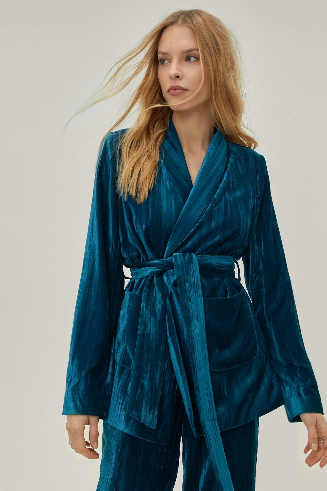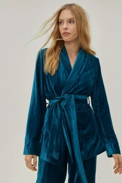 Crushing on you. This suit blazer comes in a crushed velvet and features a V neckline, longline, relaxed silhouette, long sleeves, and bow tie closure at waist. Style yours with matching flared suit pants. Item sold separate.