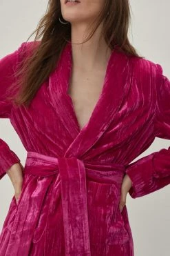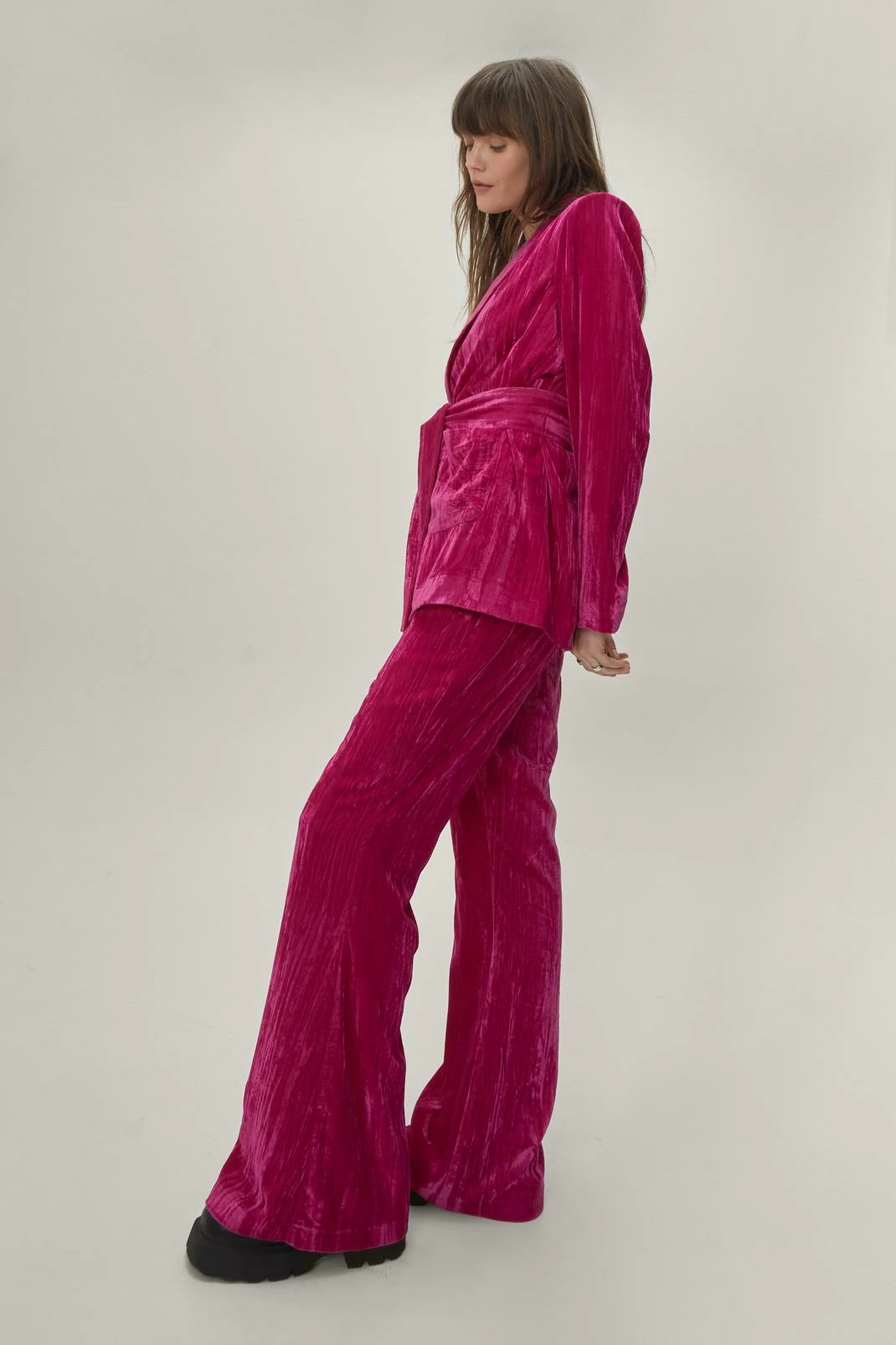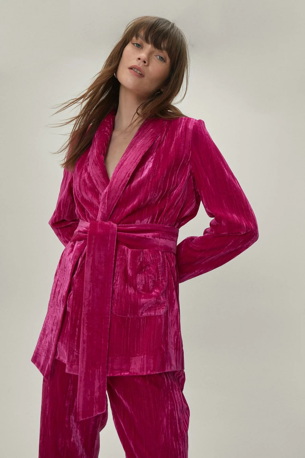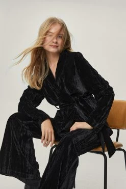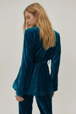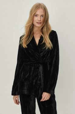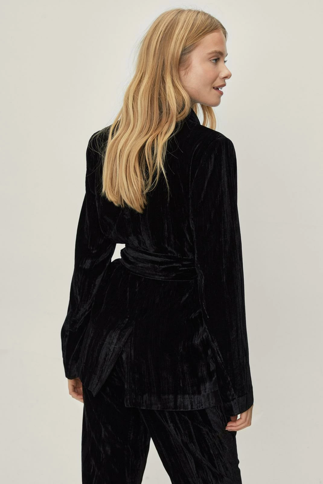 Crushing on you. This suit blazer comes in a crushed velvet and features a V neckline, longline, relaxed silhouette, long sleeves, and bow tie closure at waist. Style yours with matching flared suit pants. Item sold separate.