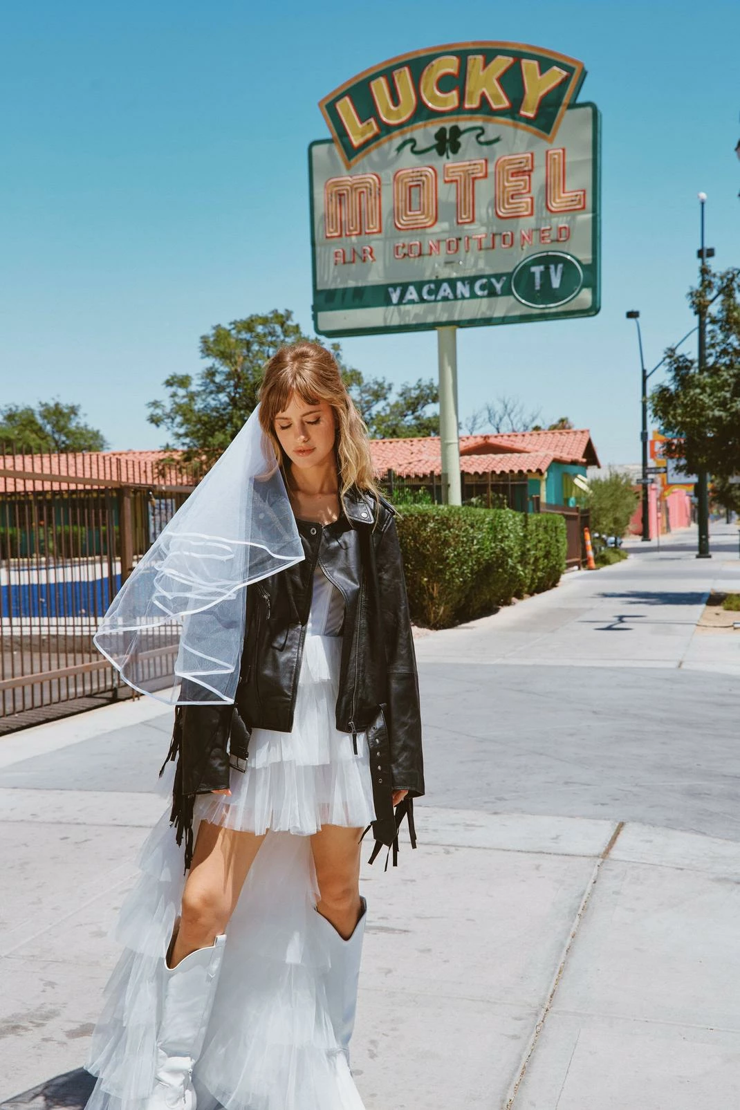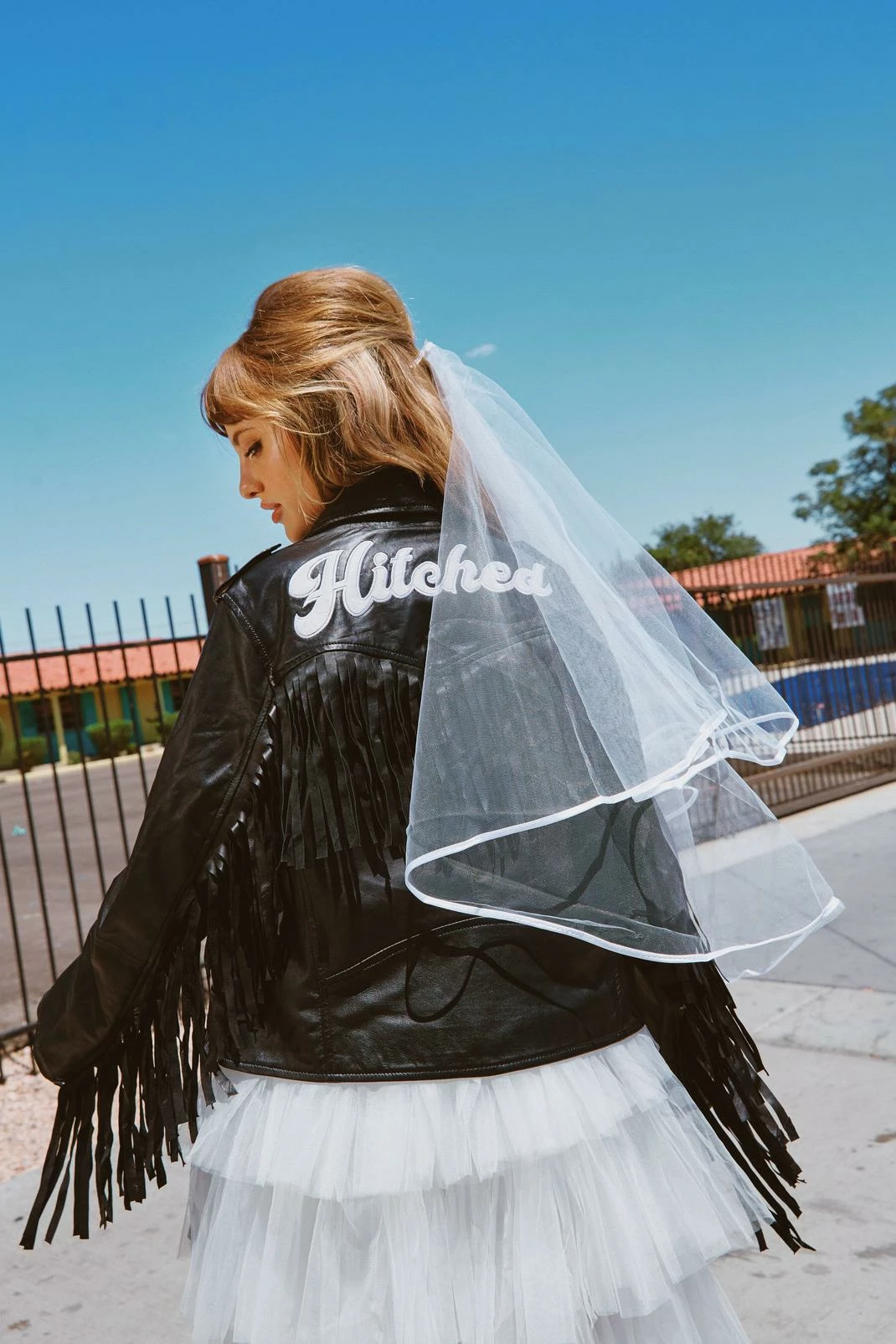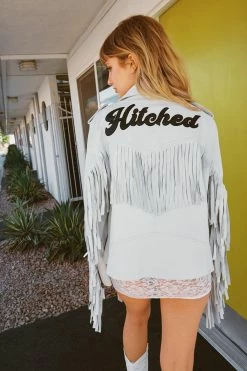 It’s me and you, baby. This jacket comes in leather and features a moto design, relaxed silhouette, asymmetric zip closure at front, belt design at hem, fringe detailing at back, and ‘Hitched’ appliqué at back.