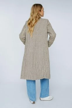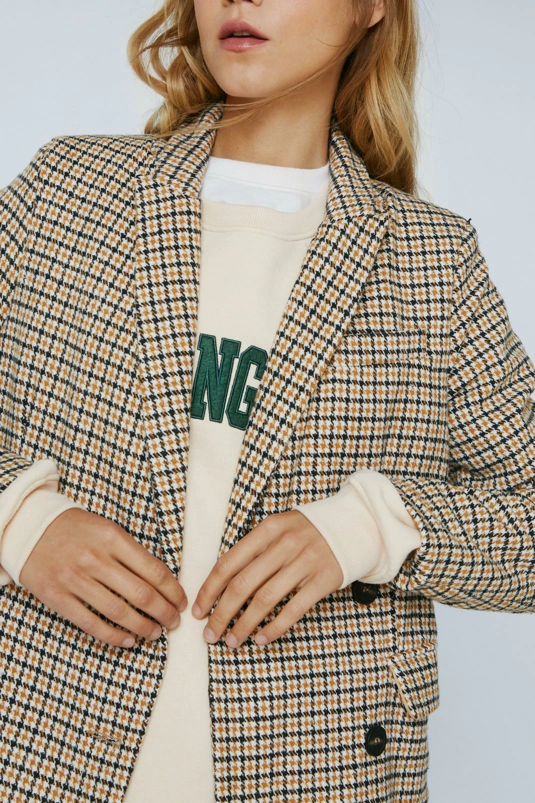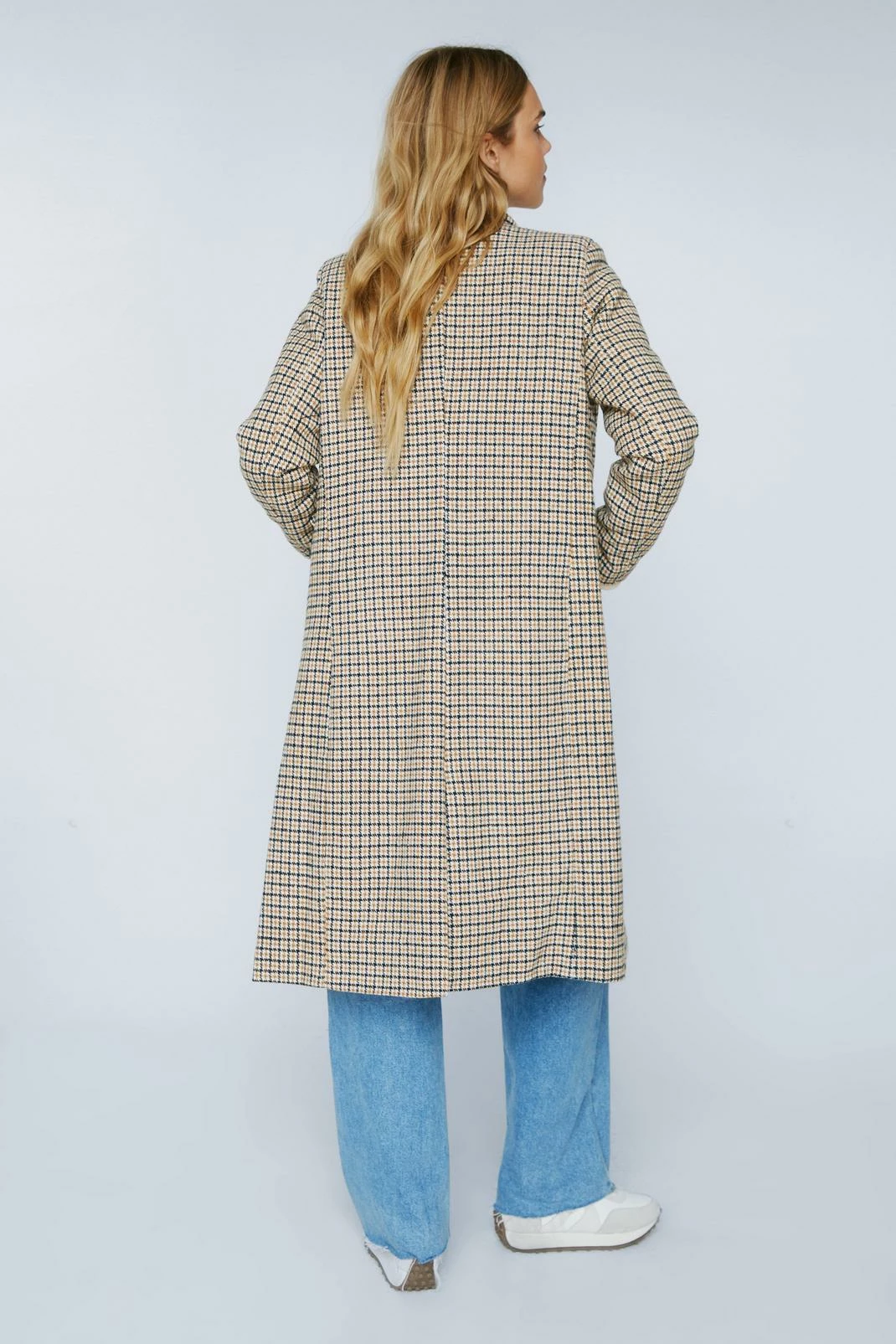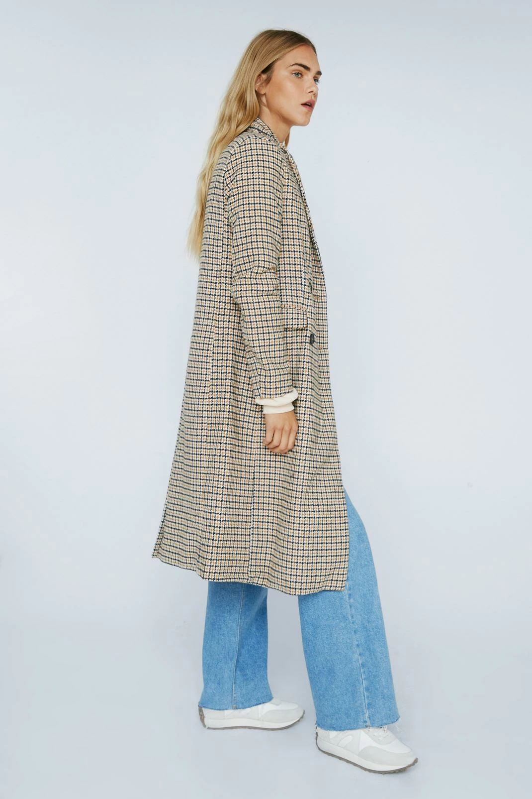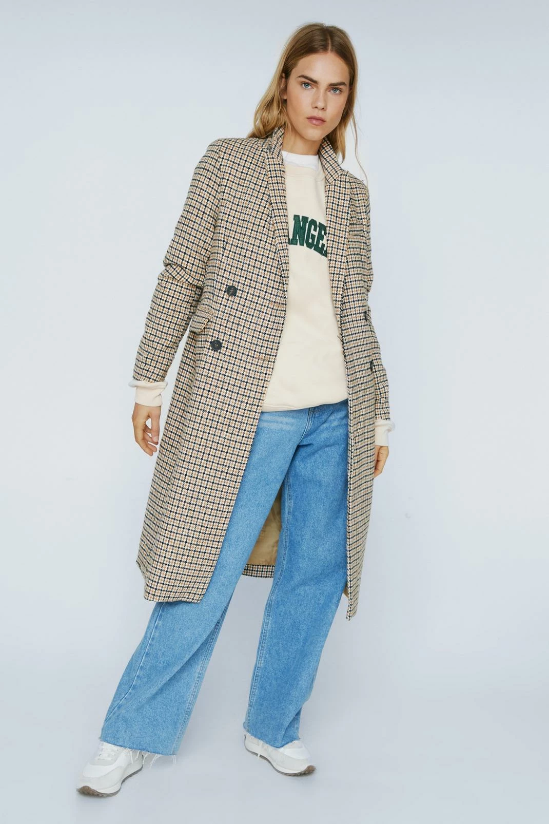 Checkin’ this baby out. This coat comes in faux wool and features a tailored, longline silhouette, double breasted closure at front, long sleeves, padded shoulders, button closures at cuffs, flap pockets, and check print throughout. Style yours with wide leg faux leather pants and chunky biker boots.