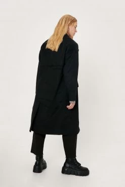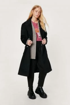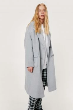 Wrap up warmer. This petite wool-look coat features an oversized, longline silhouette, pointed collared neckline, peaked lapels, double-breasted design with button closures, flap pockets at front, long sleeves, and centre back vent. For winter wanderings wear yours over printed pants and graphic T-shirts.