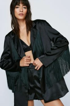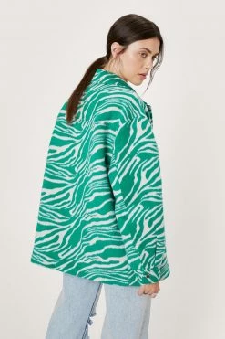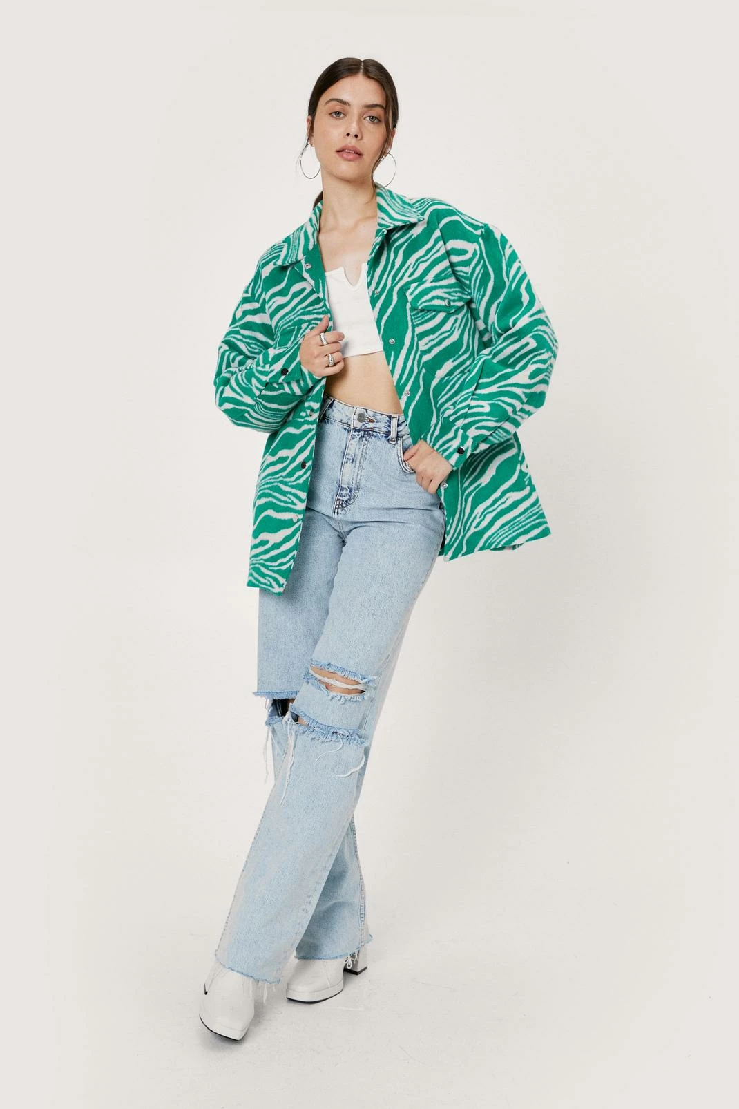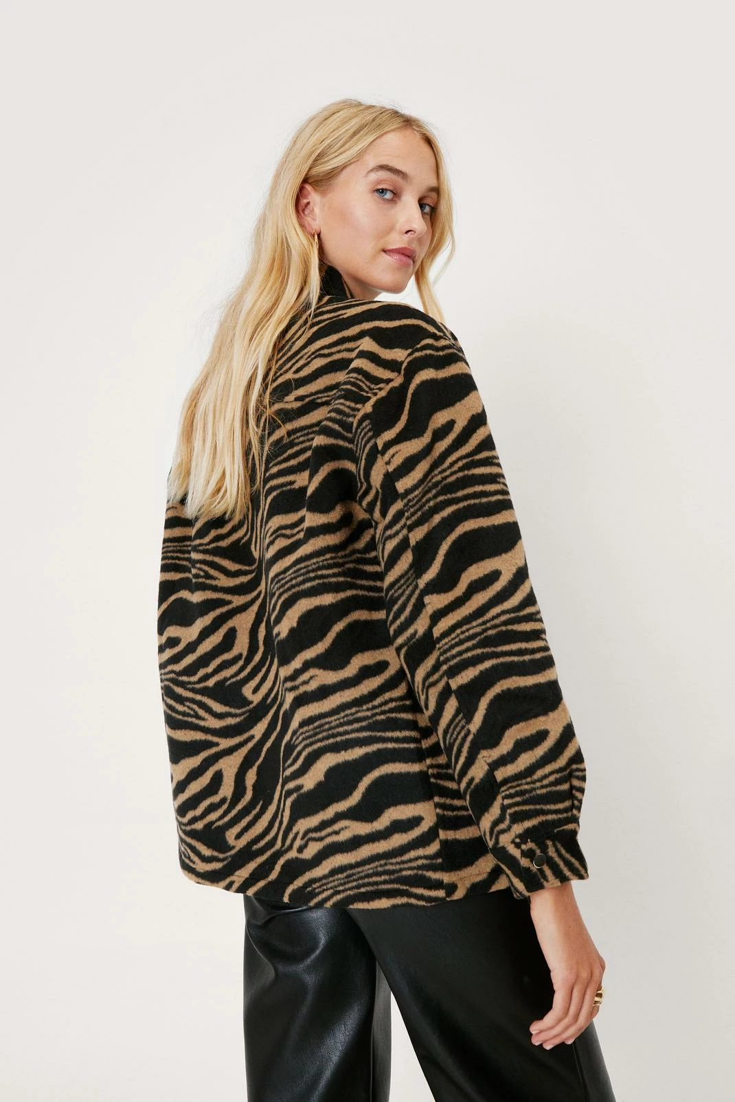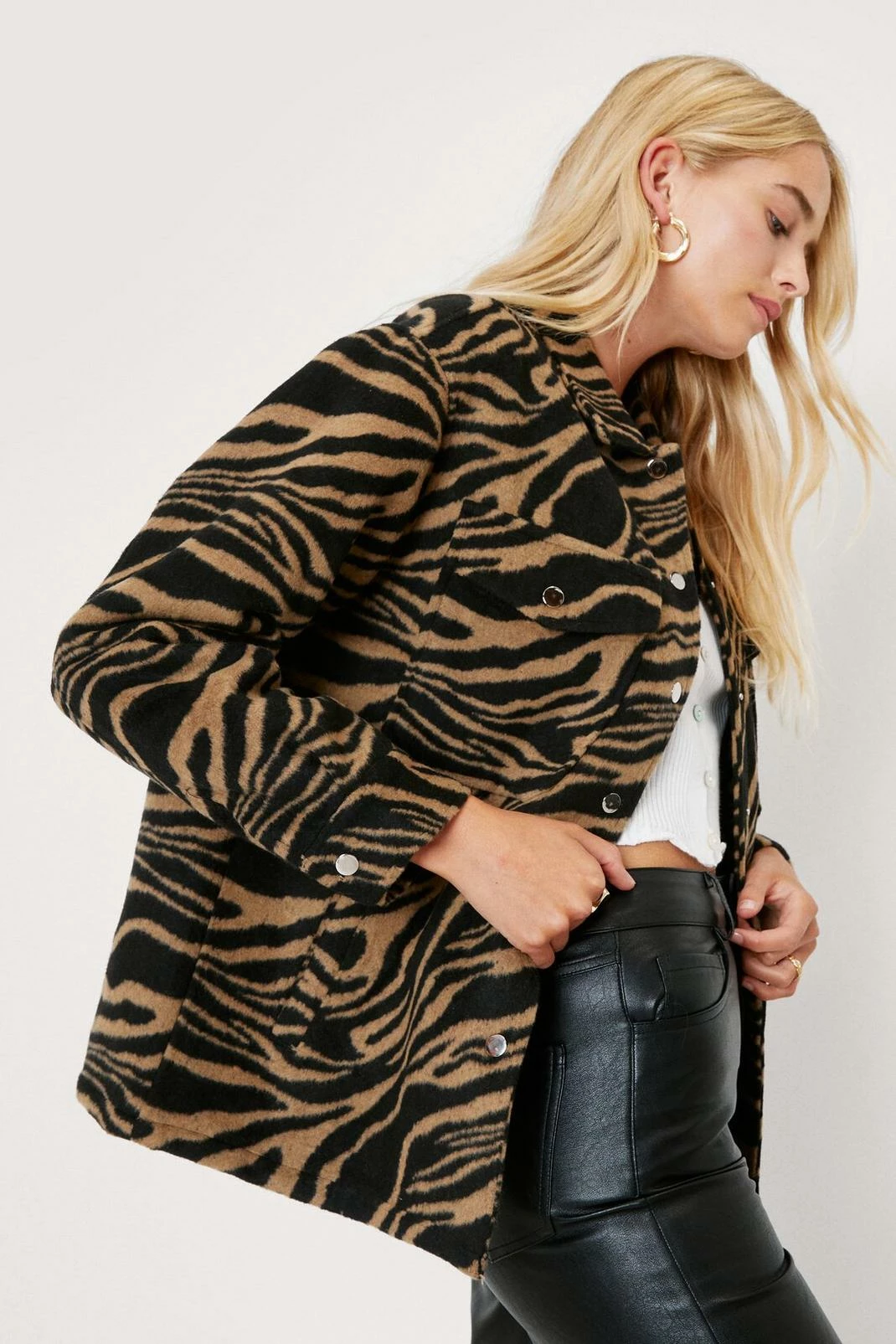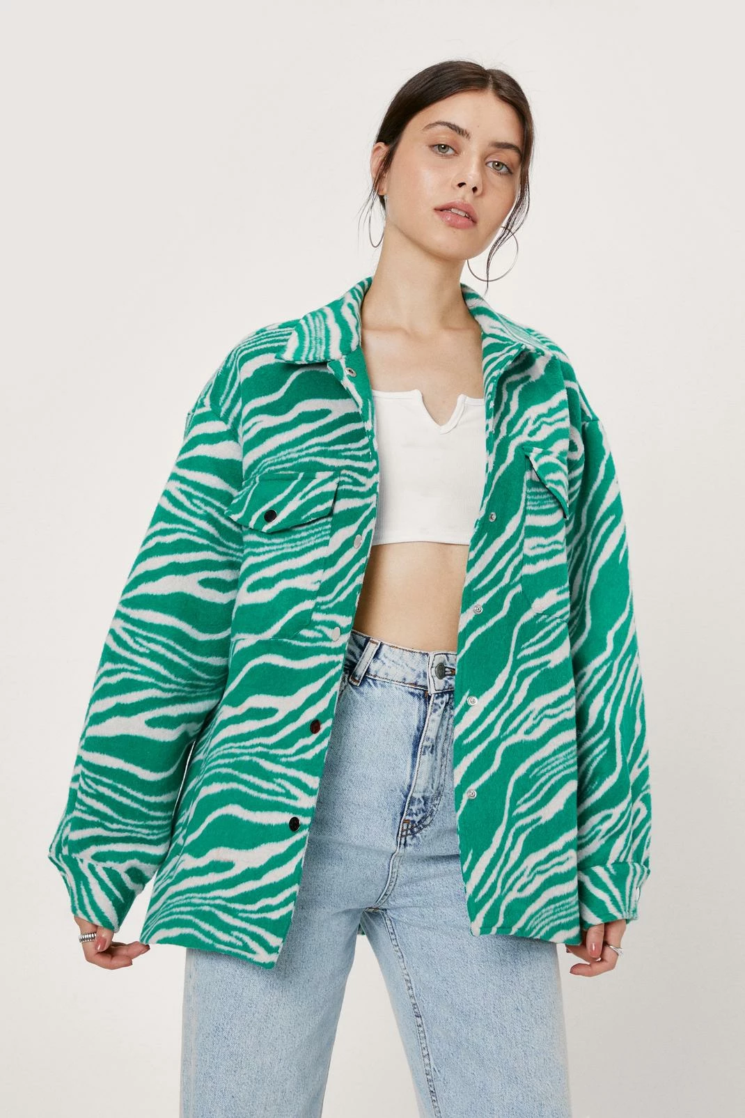 Panic over, it has pockets. This wool look shacket features an oversized, boxy silhouette, pointed collared neckline, button-down closures at front, breast pockets, side pockets, and zebra print throughout. Elevate your outfits, and stay bold in print.